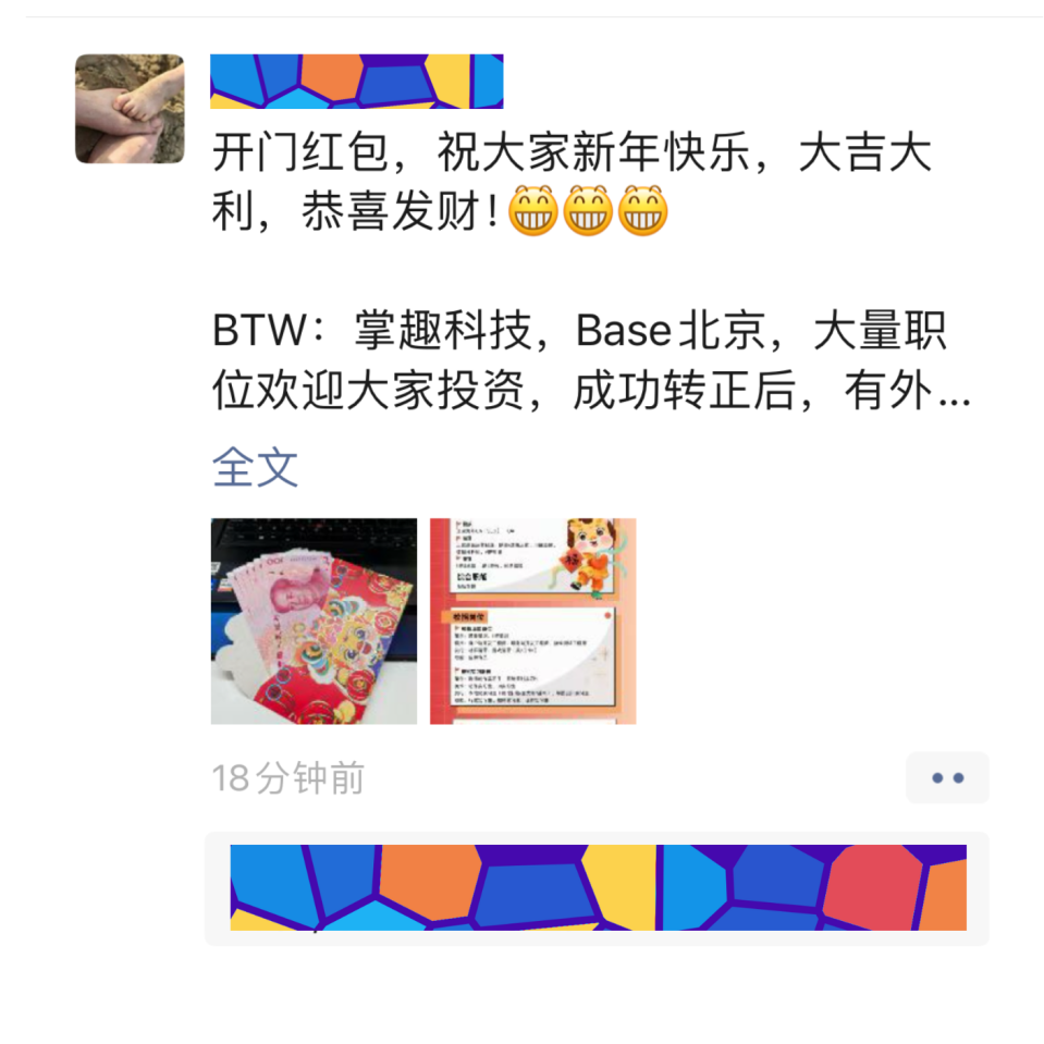 开工日当天,掌趣科技的高管们在办公区喜气洋洋的为员工们送上了开工的第一个祝福——开工利是!从掌趣圈和朋友圈就知道这泼天的富贵轮到了谁(我酸,但我不说