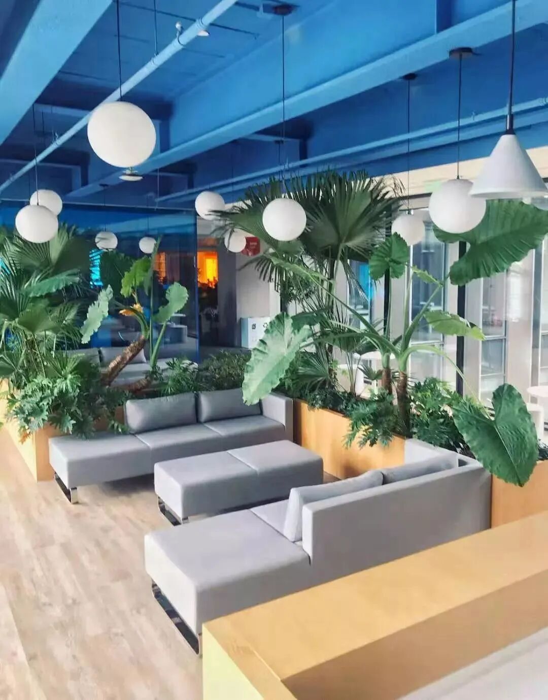 绿植天然会让人放松,引入大量绿植可以说是友好氛围营造的利器,用法也很多样,成片隔而不断,或点缀其中,当然,零星的点缀很难有效果,氛围感的重点是提高绿植占比。