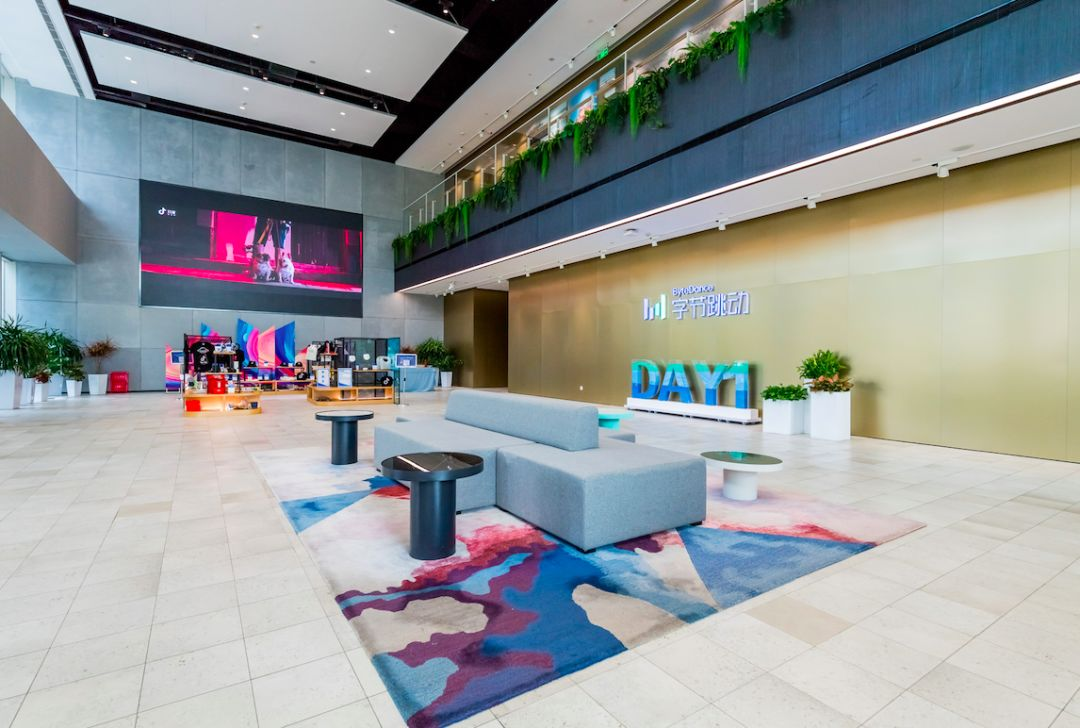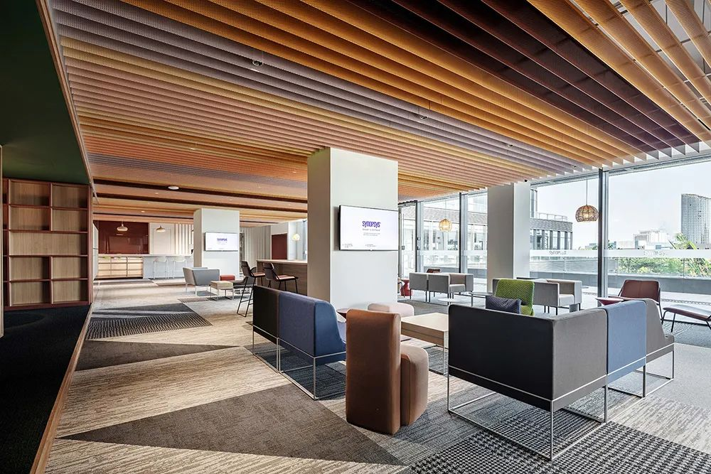 新思科技就选用浓烈的色彩与拼接图案的碰撞,来塑造环境的活力。