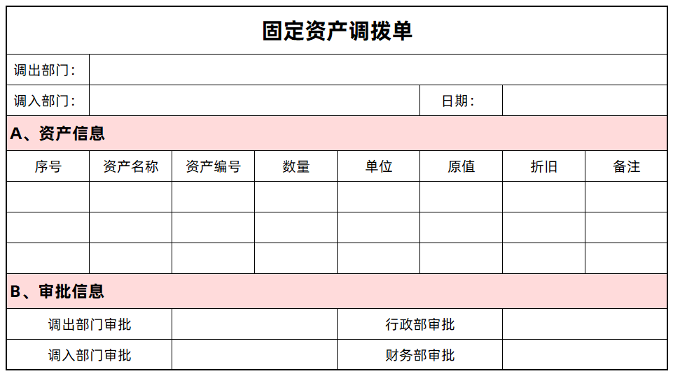 部门或分公司间的调拨同样需要填写相关申请,如过程中产生运输成本,需双方协商分摊。资产调拨单示例: