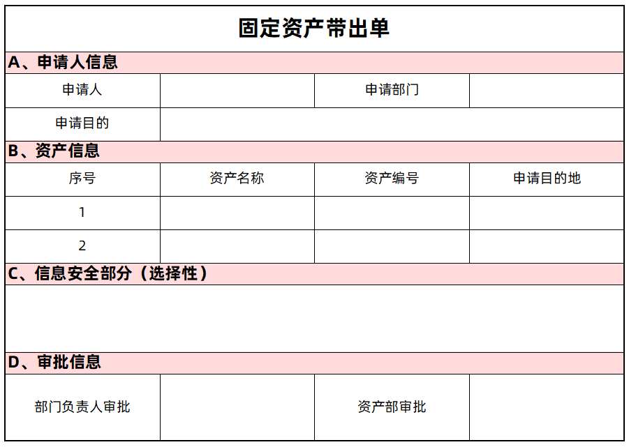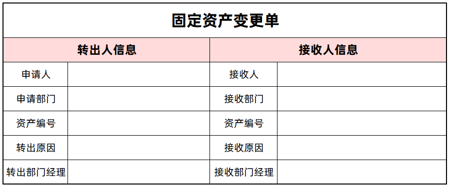 一定要做好变更过程的监管,很多员工私自交换设备,会给后期的资产盘点带来很多不必要的麻烦。资产变更单示例: