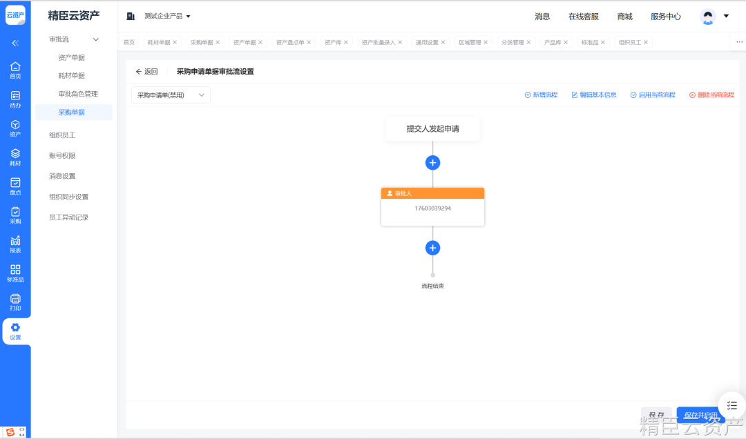 精臣云资产支持针对不同的资产类别,设置不同的审批流程。例如低值易耗品可仅由行政部审批后发放,电脑设备则需要行政、HR、IT等多个各部门审批后再发放。