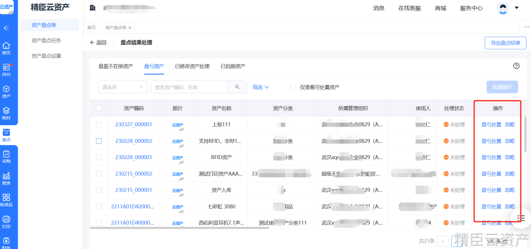 结束盘点后,在后台即可看到本次盘点任务的结果,盘亏、盘盈等资产列表一目了然,方便行政进行后续的处理。