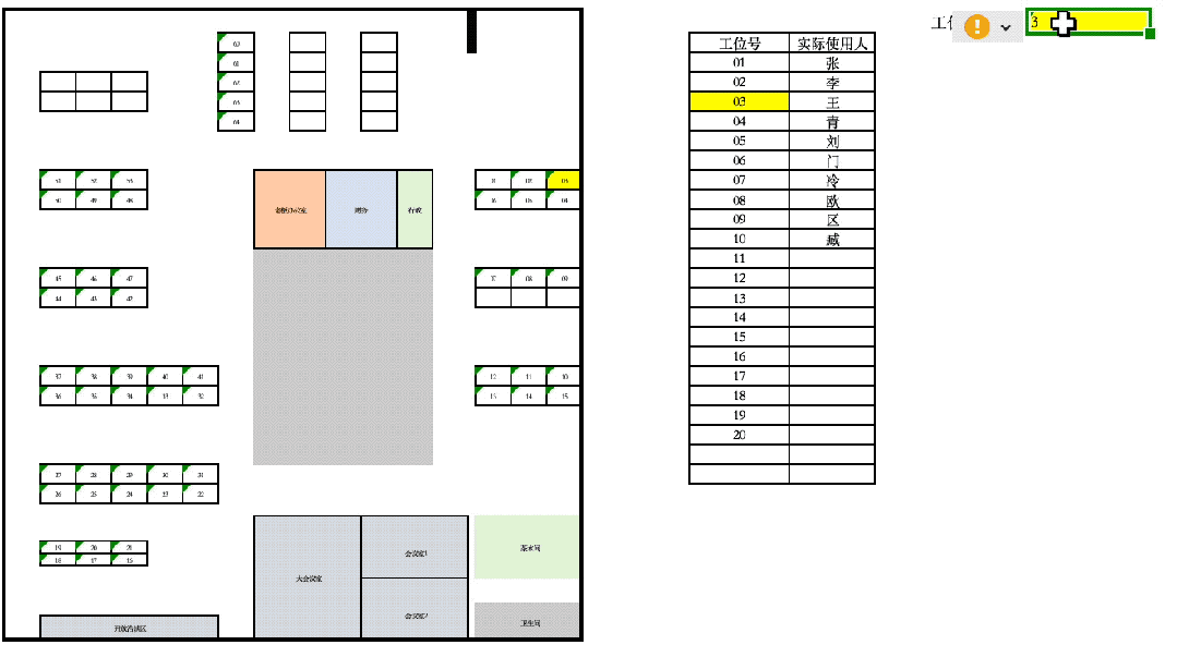 将表格网线设置成不可见模式,在空白页上使用Excel单元格代替工位,按照实际的工位排布画出工位即可。使用颜色填充,可以清晰标注出不同部门的工位区。