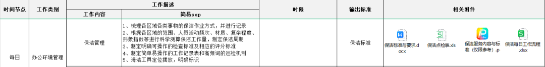 1、梳理各区域各类事物的保洁作业方式,并进行记录
