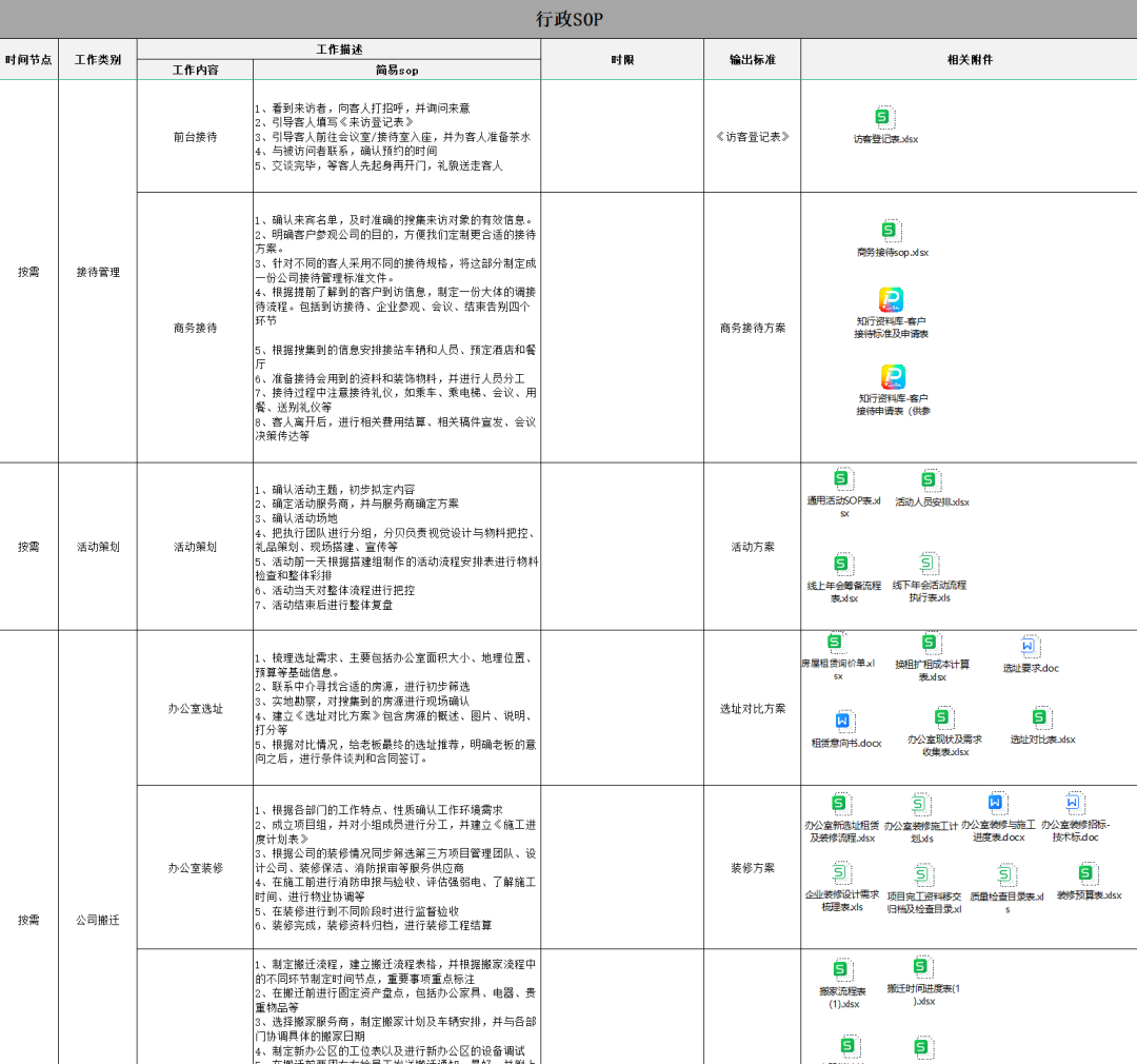 行政工作虽然琐碎繁杂,但用心观察就会发现很多都是流程化的,无论是企业活动策划、企业接待,还是固资盘点、公司搬迁,巧妙的利用一份SOP工作表格就能够理清思路,避免重复踩坑!