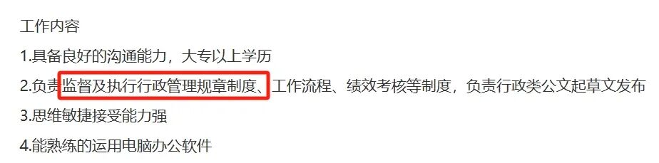从行政各个岗位的招聘要求也能看出,无论是管理岗位还是非管理岗位,都或多或少的对“行政管理制度的制定”这项工作技能有所要求。