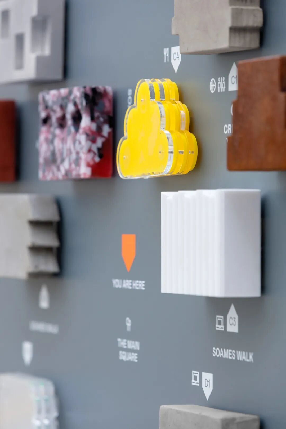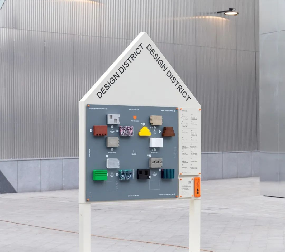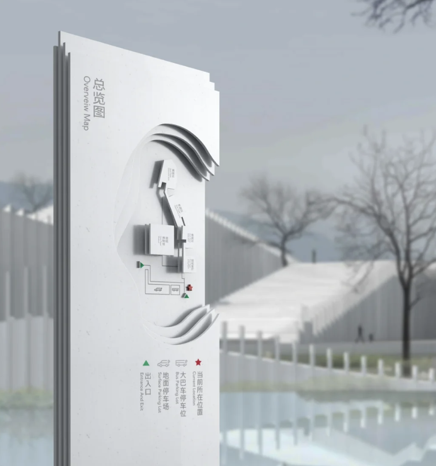 还可以利用每栋建筑独特的形式以及建筑材料作为导视组件,设计合适的颜色和版式能让你的空间鸟瞰图更有创造力!这样的鸟瞰图不仅承载了指引功能,还可以作为一个空间亮点,让来访者印象深刻。
