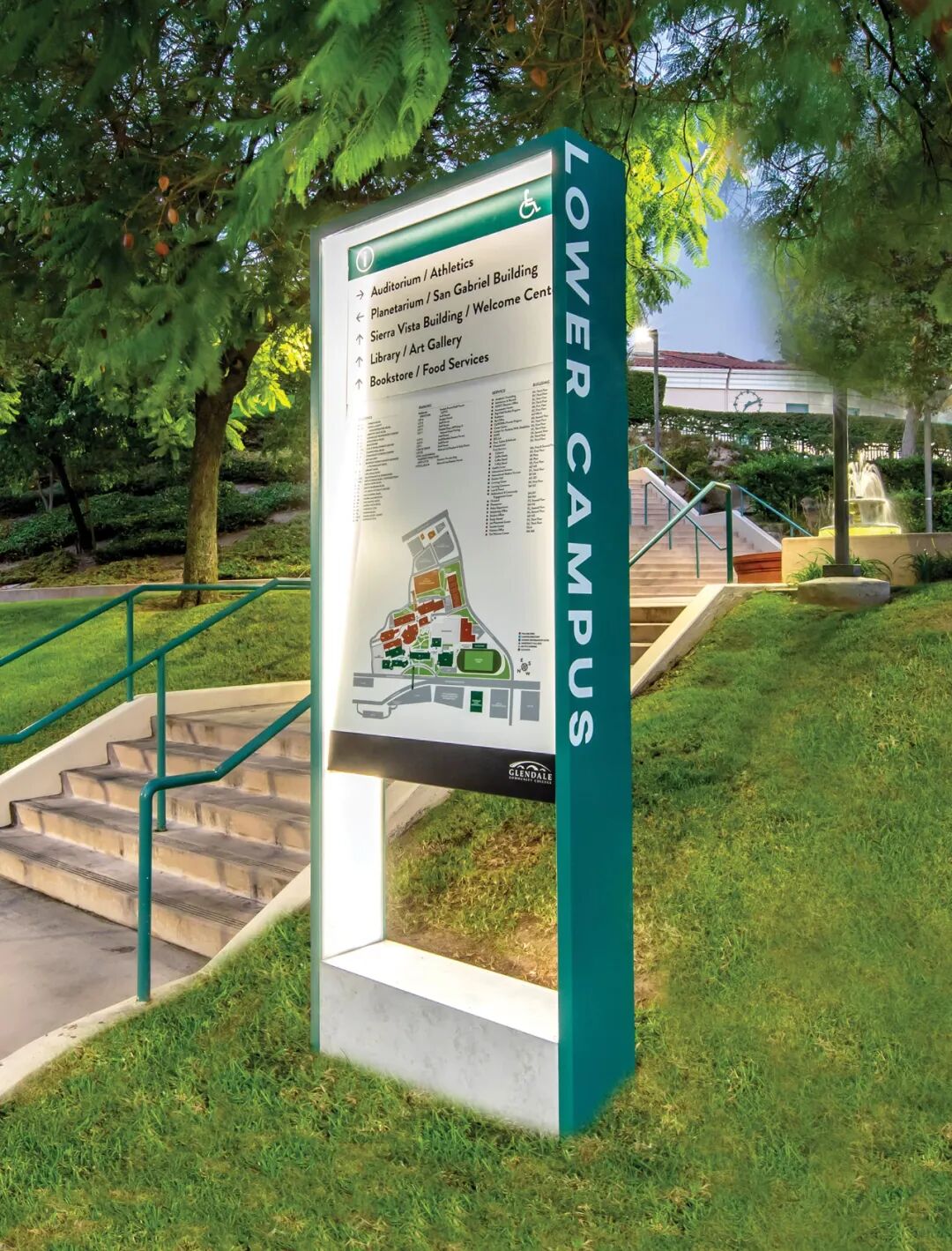 还可以做成这种立牌式的,适合大分岔路口。立牌上不仅可以显示不同方向的空间内容,还可以将园区地图也放在上面,辅助使用者辨认。