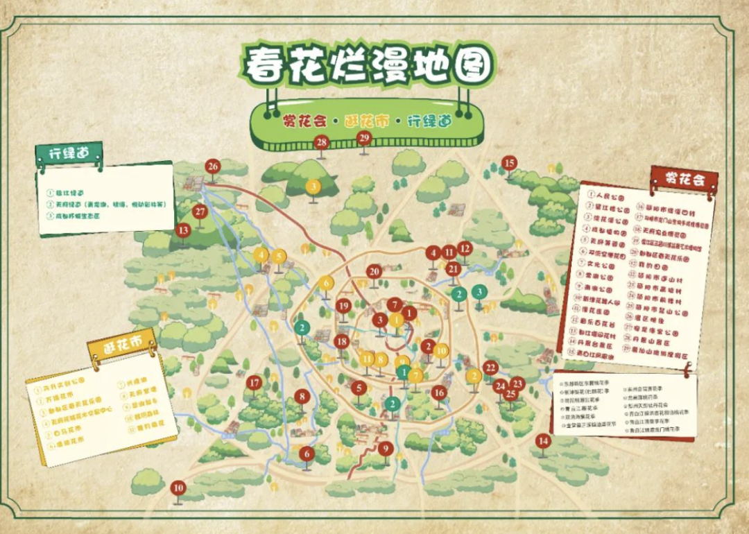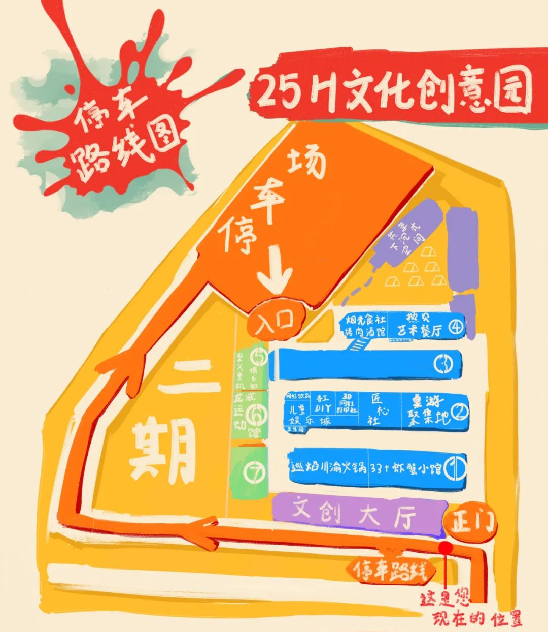 如果公司是企业园区,可以将鸟瞰图抽象制作成漫画的形式。不需要按照比例显示,只要展示相对方位即可,制作难度低,填充上颜色就能收获一份更有趣味感的游览地图。