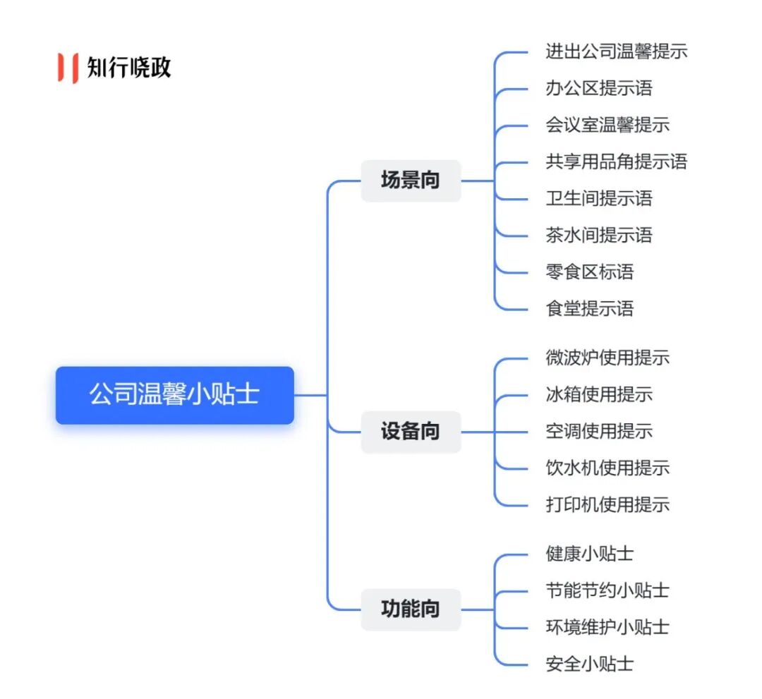 本期小知又更新了一期温馨小贴士合集,总结了场景向、设备向和功能向三大类,共17小类的提示语,供行政er们参考,一起来看看吧~