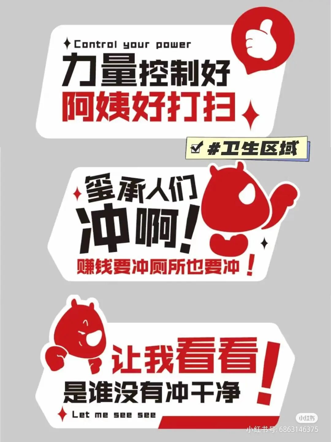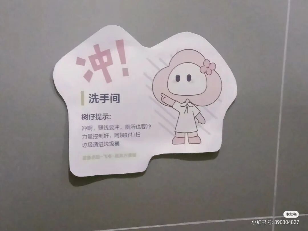 卫生间里着重需要维护马桶或蹲厕、洗盥池、地面、镜面等设施设备的卫生情况。相应的提示语也会侧重督促大家文明如厕: