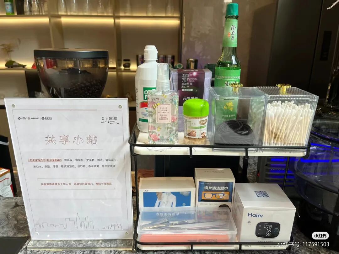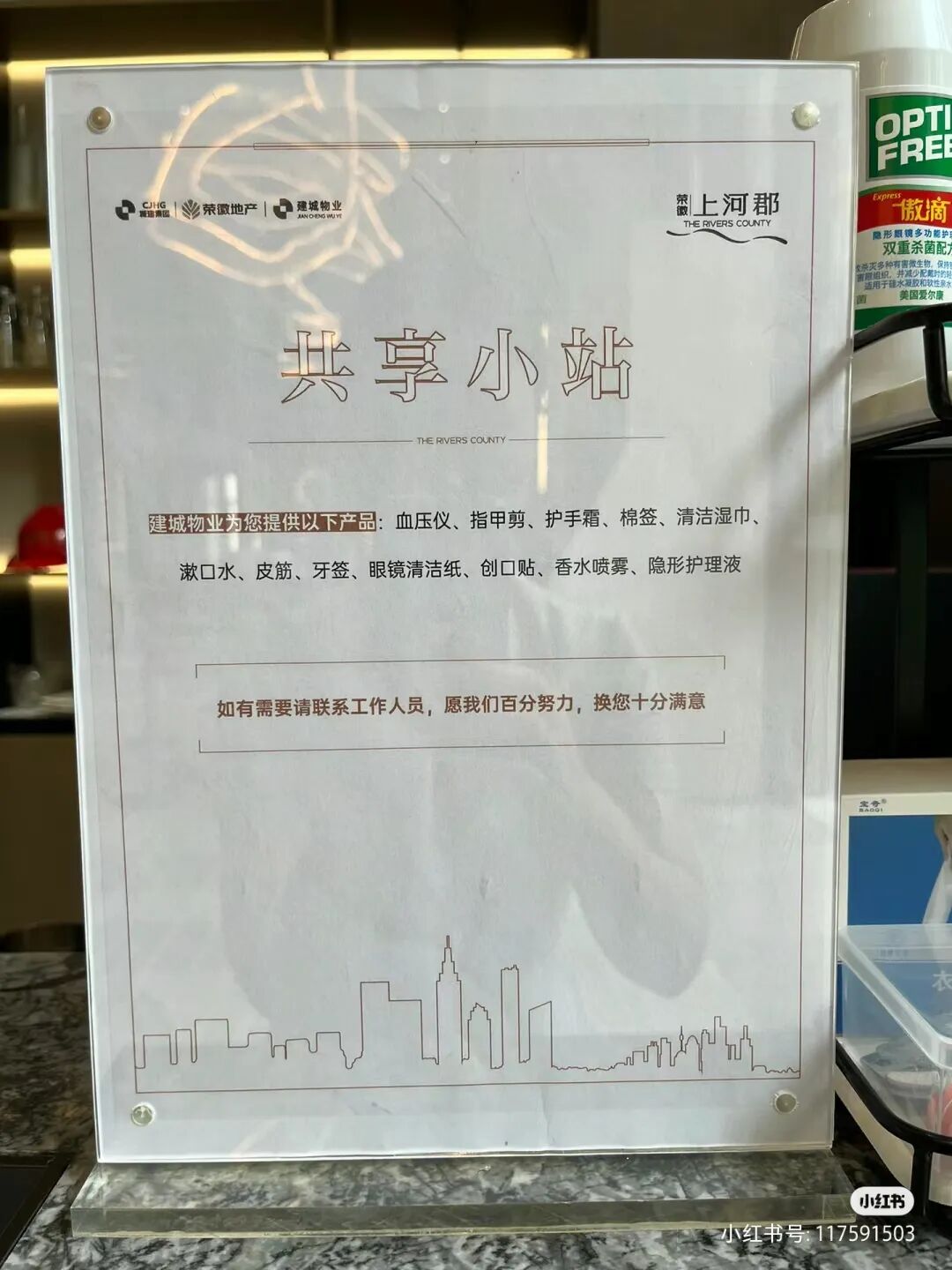 还有其他公司设置的共享小站,具备了不少用品,通常一旁也会立个小牌进行说明:
