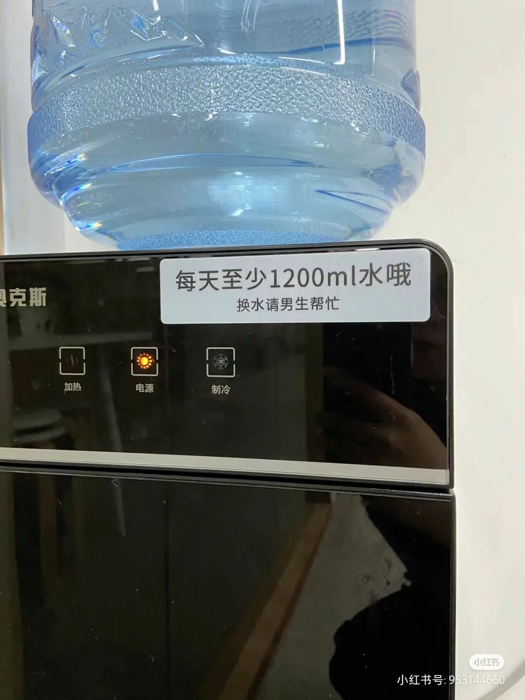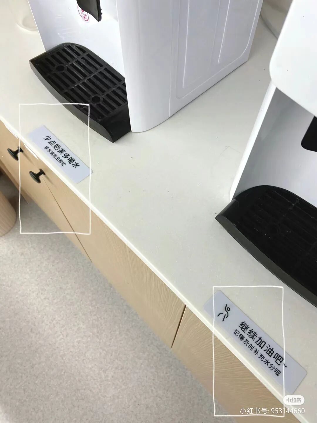 在员工使用饮水机时,则可以添加多喝水的提示,发现水没了,则可以温馨提示找男生换水,例如某家婴童品牌公司的饮水机温馨标语:“每天至少1200ml水哦,换水请男生帮忙”