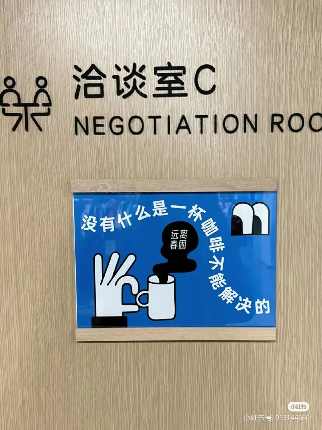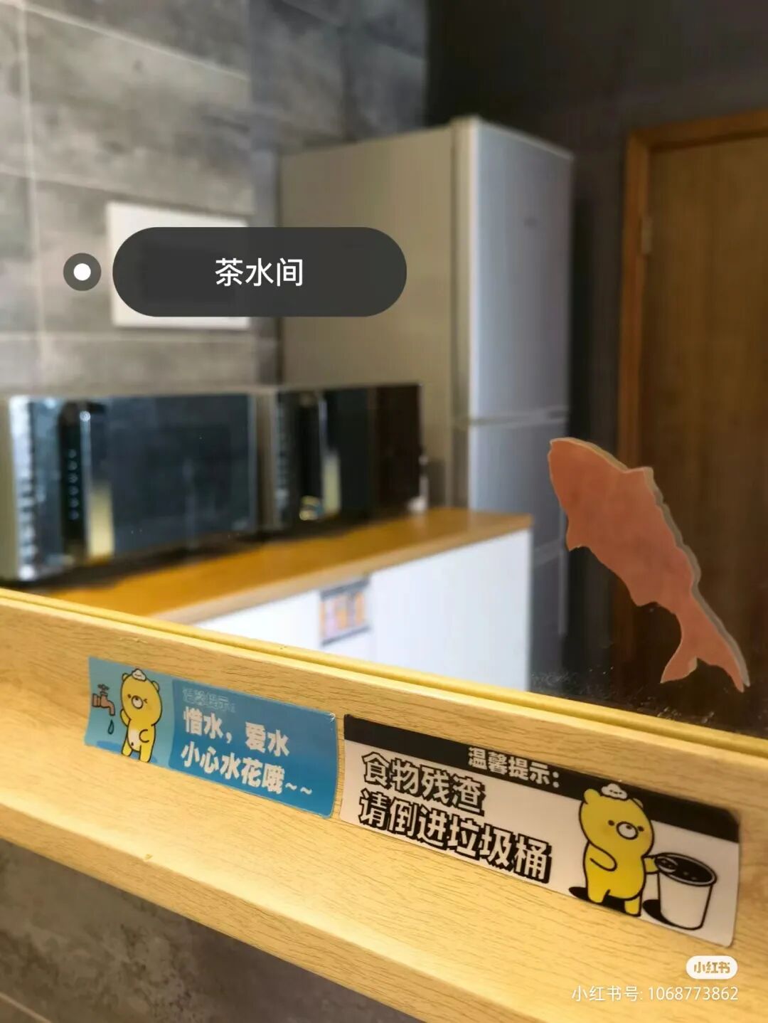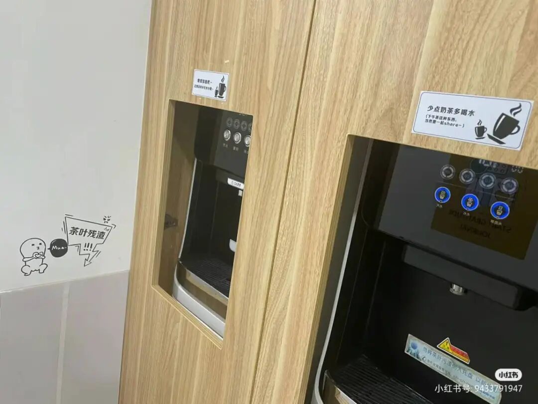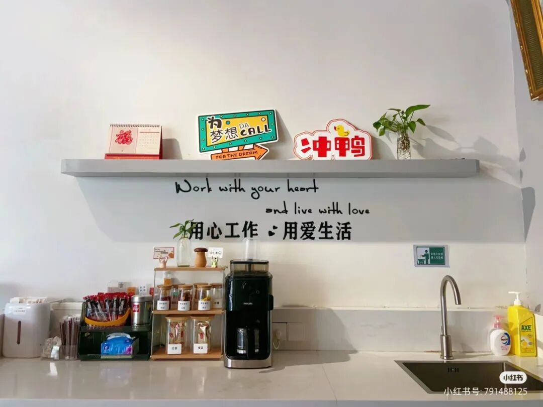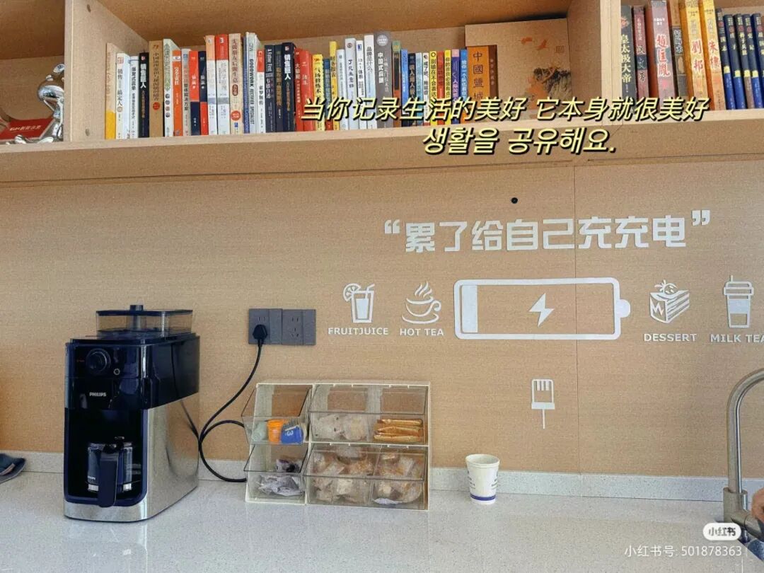 茶水间属于员工放松的区域之一,提示语可以是让大家保持耐心,也可以是在提供咖啡和茶包服务时的贴心建议——