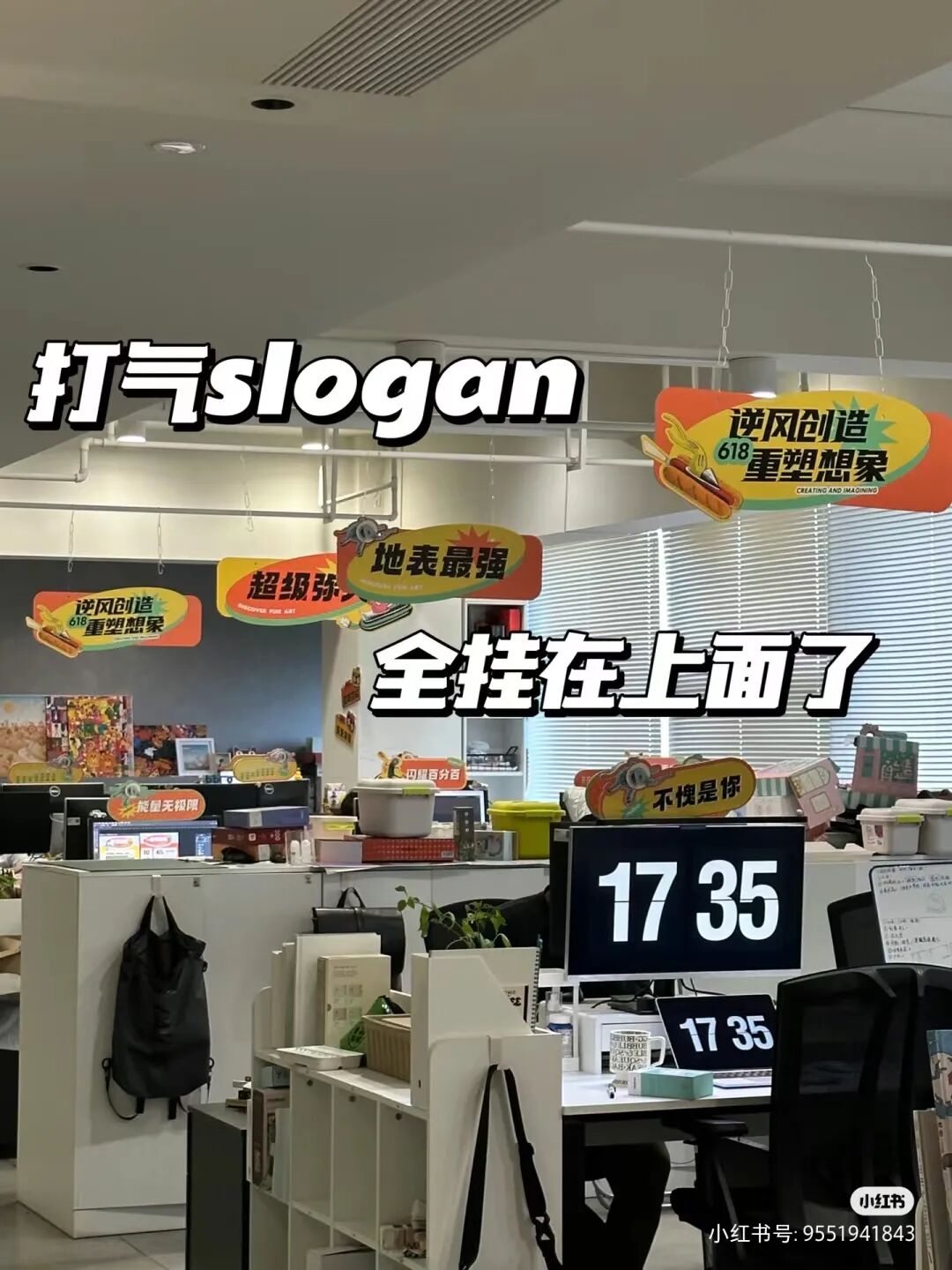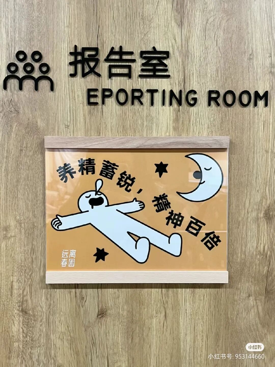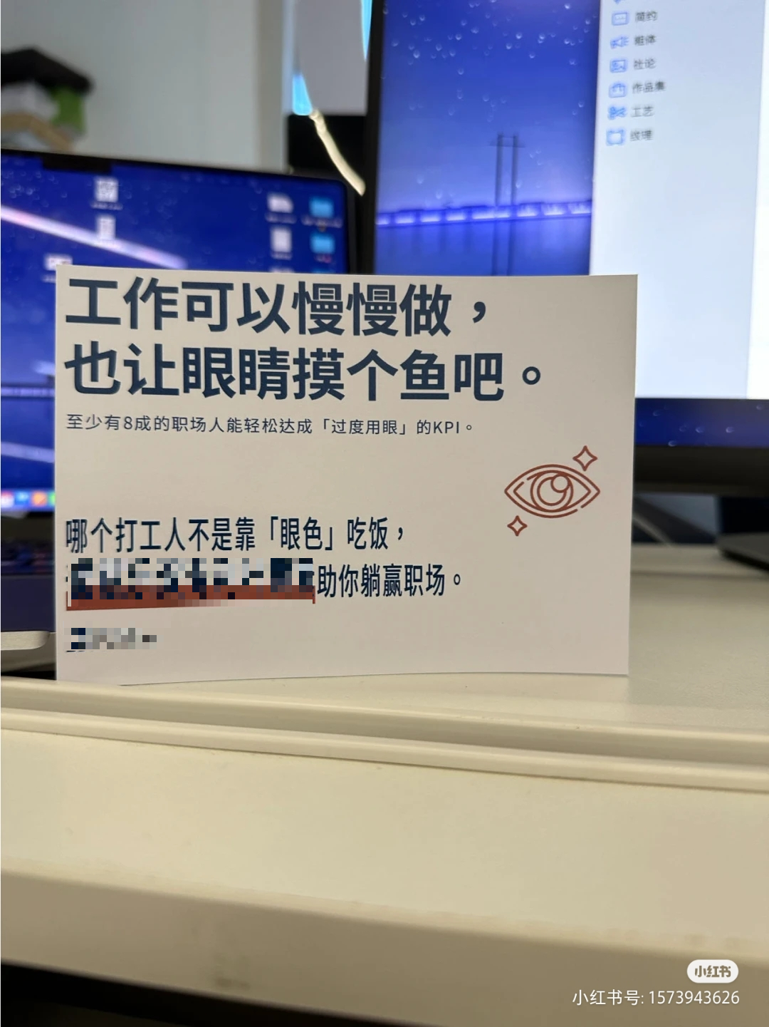 对于一直坐在电脑前的员工,也可以添加保护视力,减少疲劳的相关标语:“工作可以慢慢做,也让眼睛摸个鱼吧。”