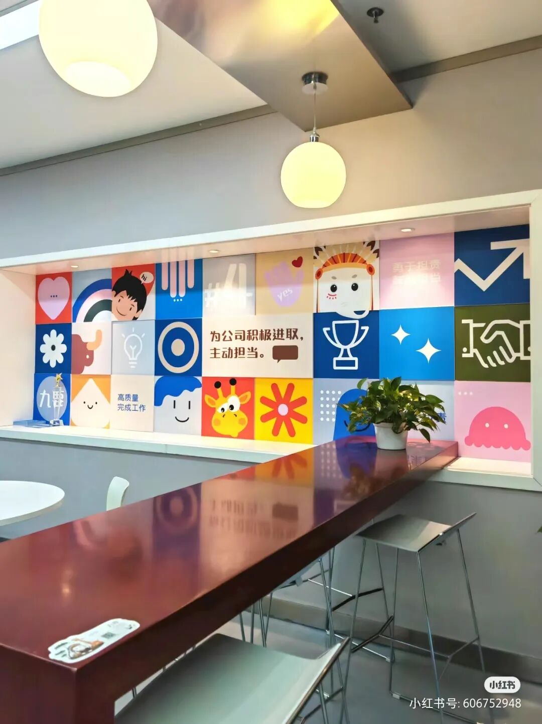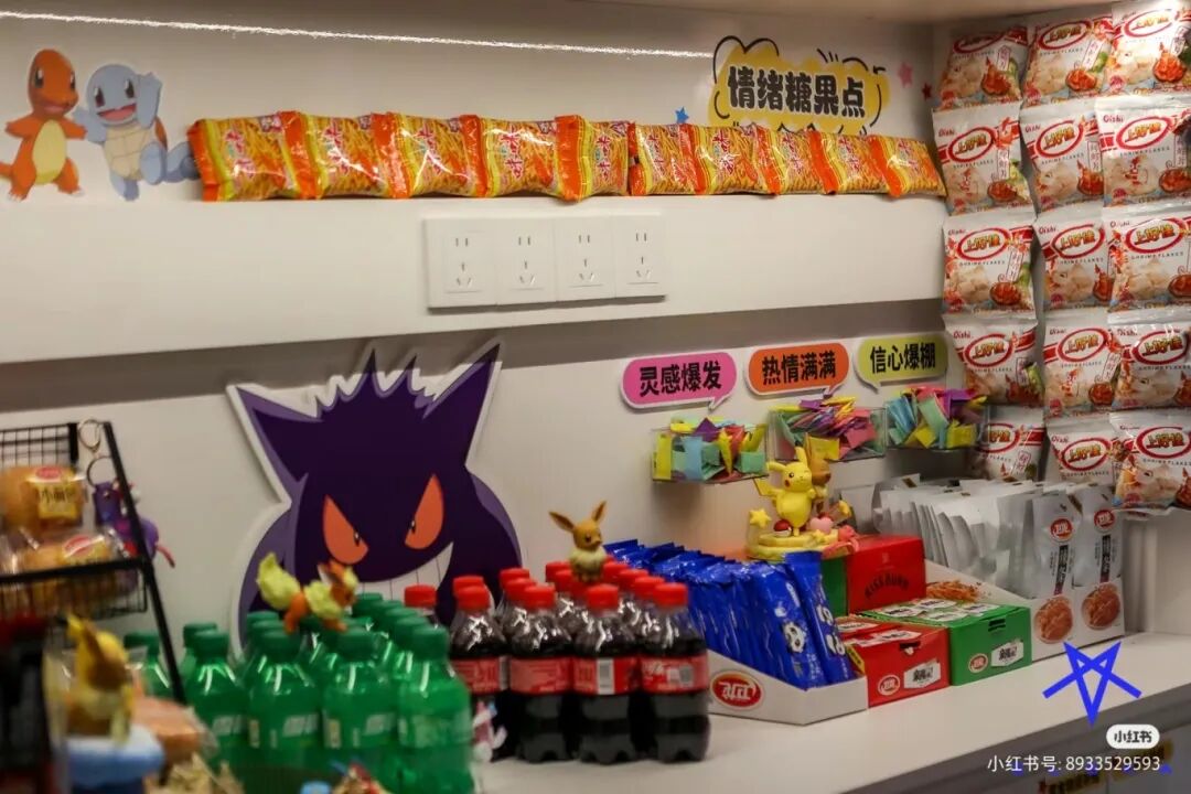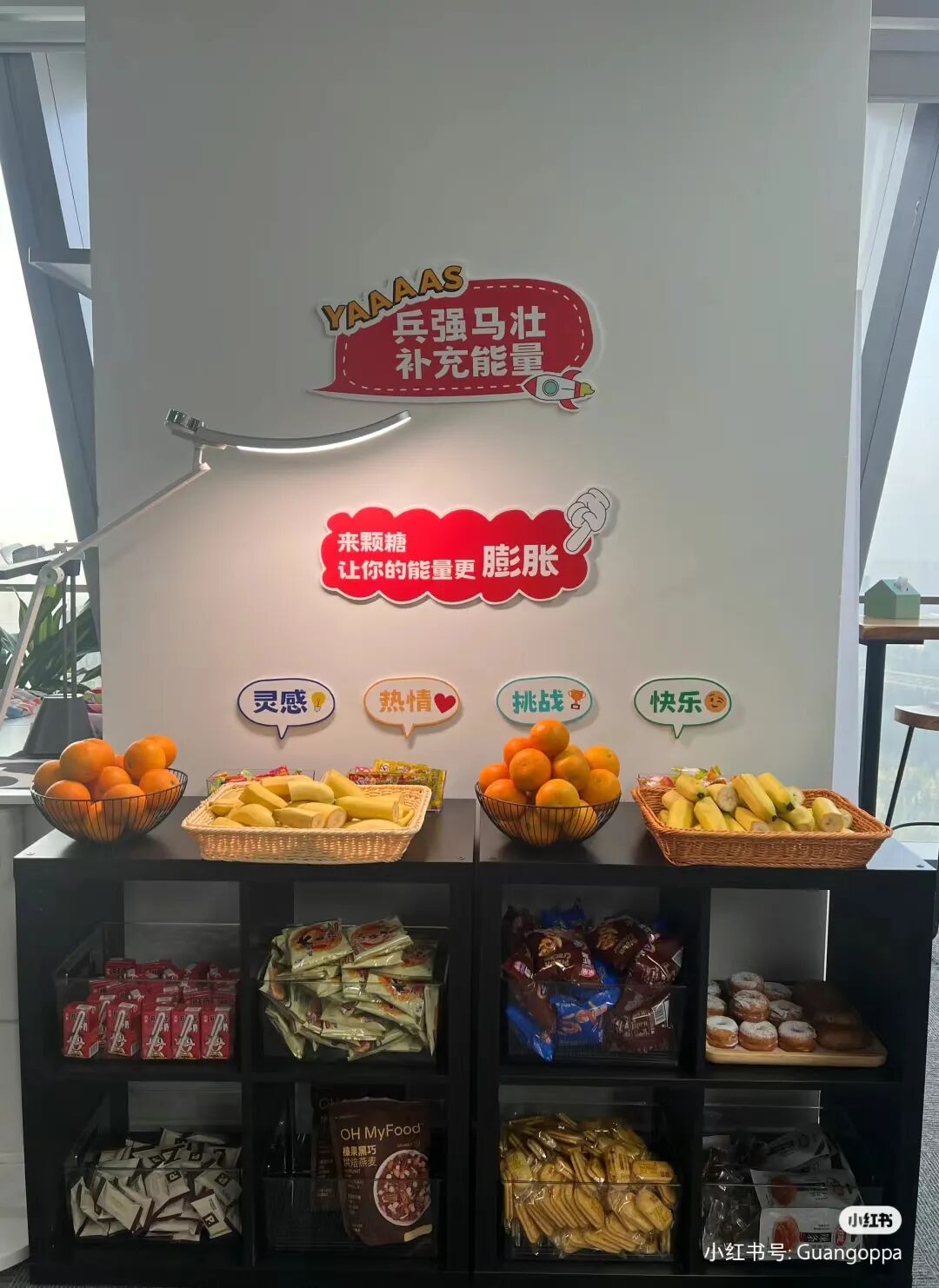 例如某家公司的零食区结合了动漫风格做了个“多巴胺补给站”。还有“灵感爆发”“热情满满”“信心爆棚”等关键词的“情绪糖果点”。