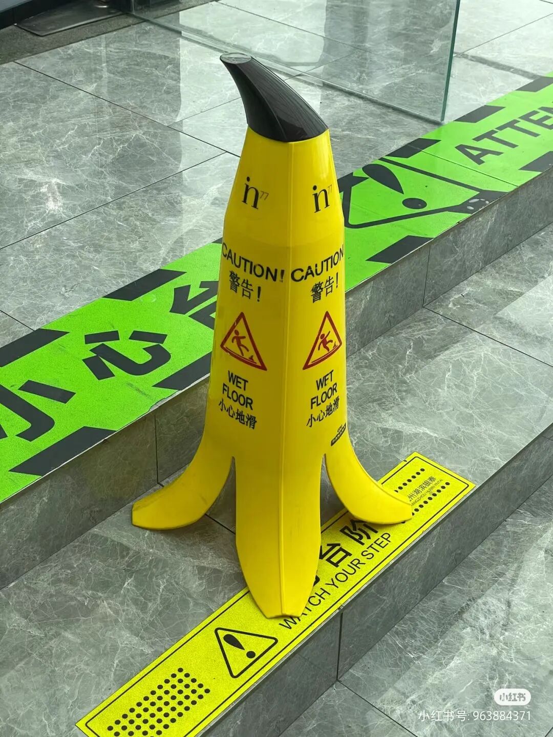 还有在光滑的地面,提醒路过的人小心滑倒: