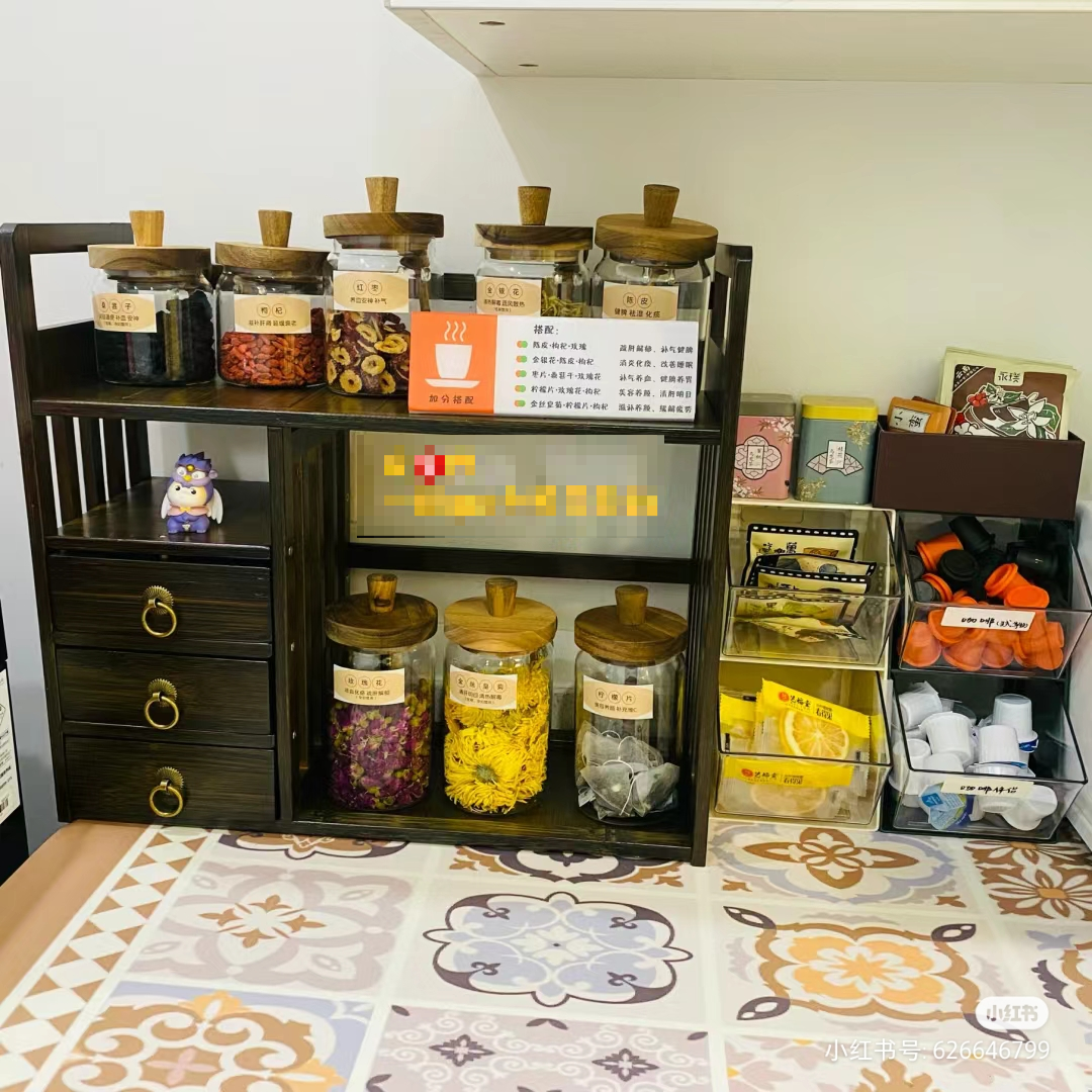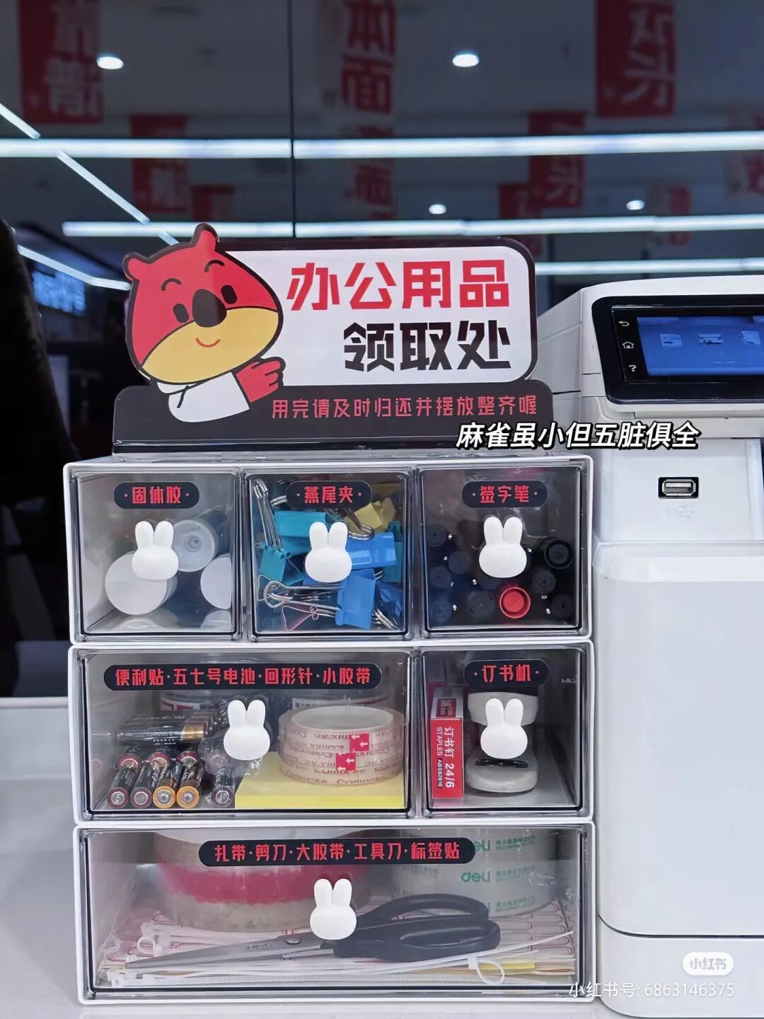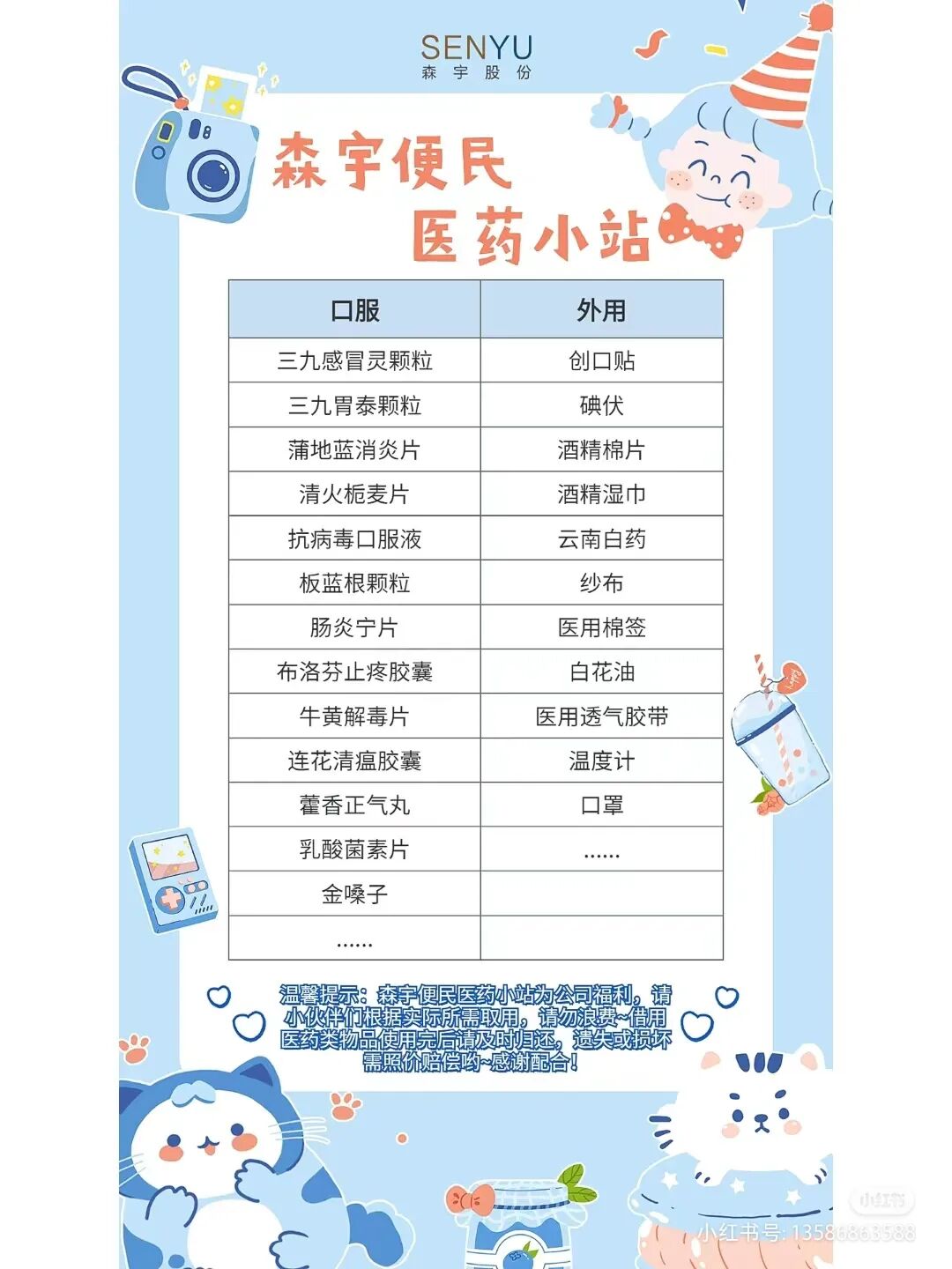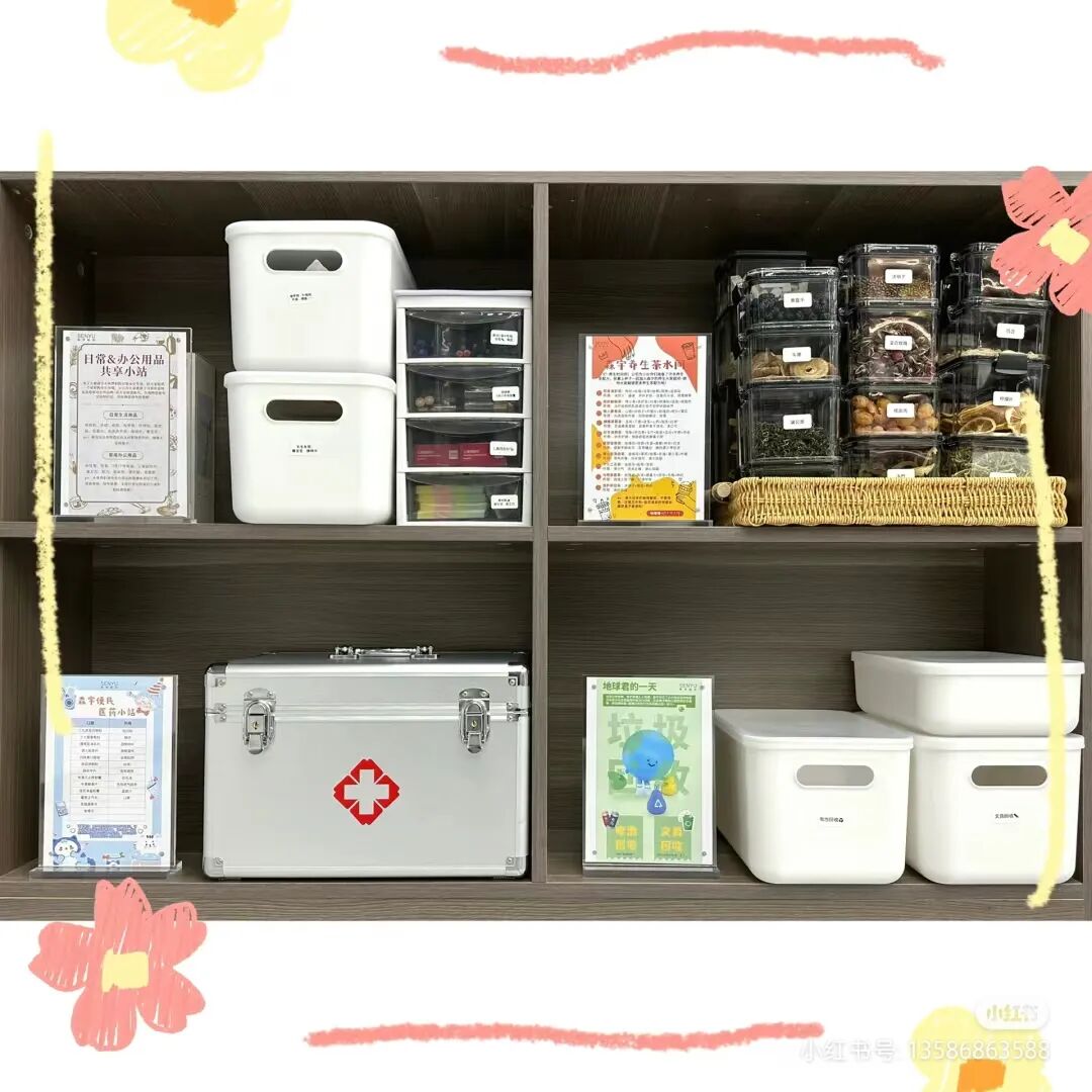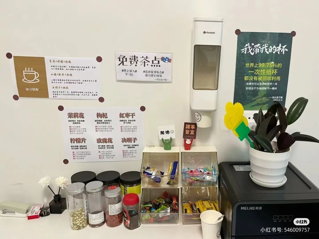 而下面这家公司的共享用品区域品类则由医药小站、养生茶、日常办公用品以及垃圾回收站组成,每个小区域都贴上了相应的使用提示海报: