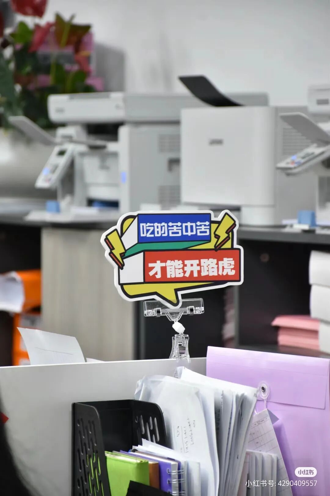 对于工位柜子也可以做出相关提示,并添加让大家保持工位整洁的标语,例如:”也不是说都要整整齐齐,但有些杂七杂八的还是要收拾起来,眼不见为净的好“。