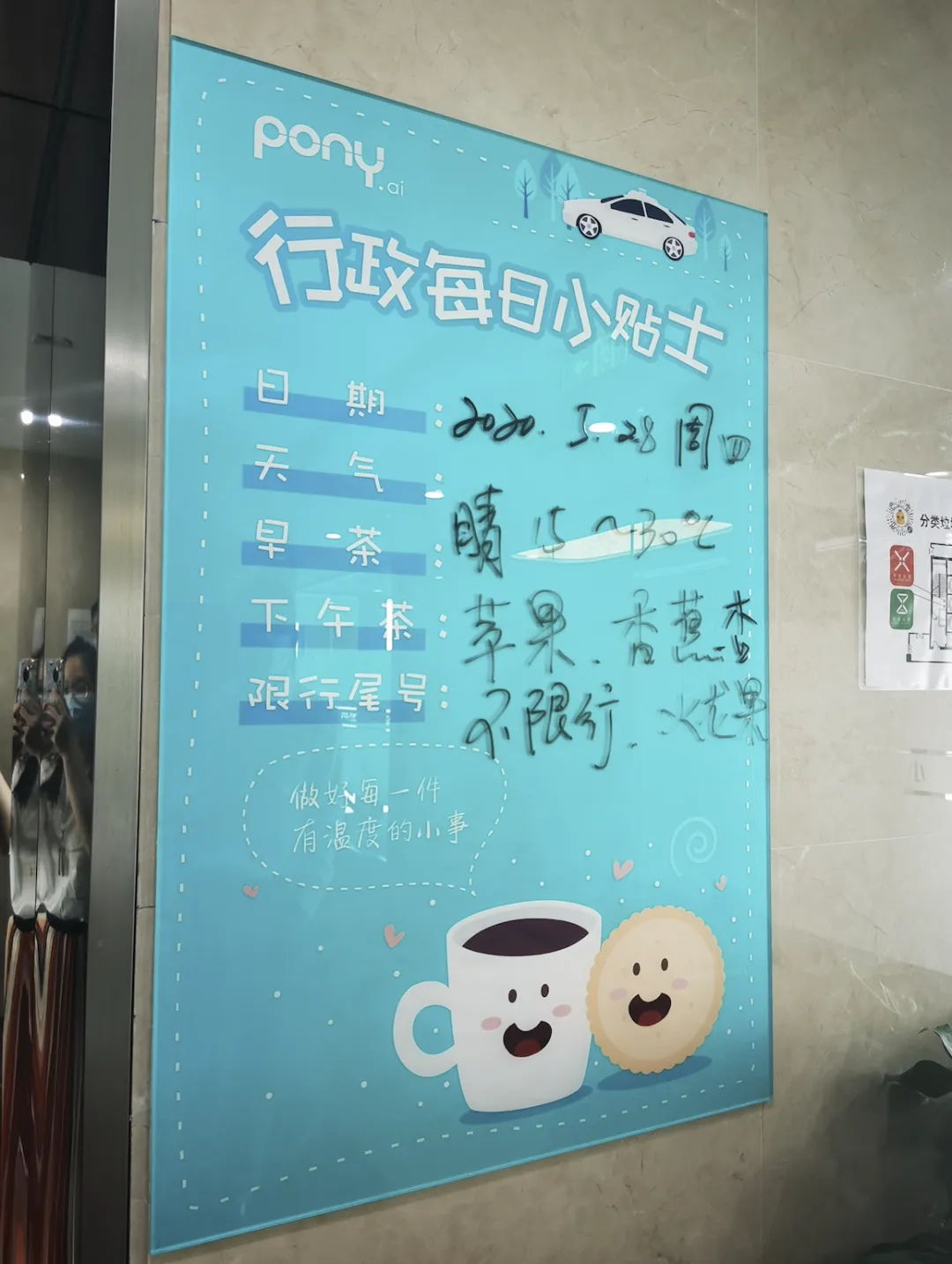 除了打卡这类提示语,还有的公司会设置一些特别的行政小贴士,例如小马智行实时更新在电梯口的「行政每日小贴士」,上班走出电梯就看到,这一天从早上起就有了期待。⏬