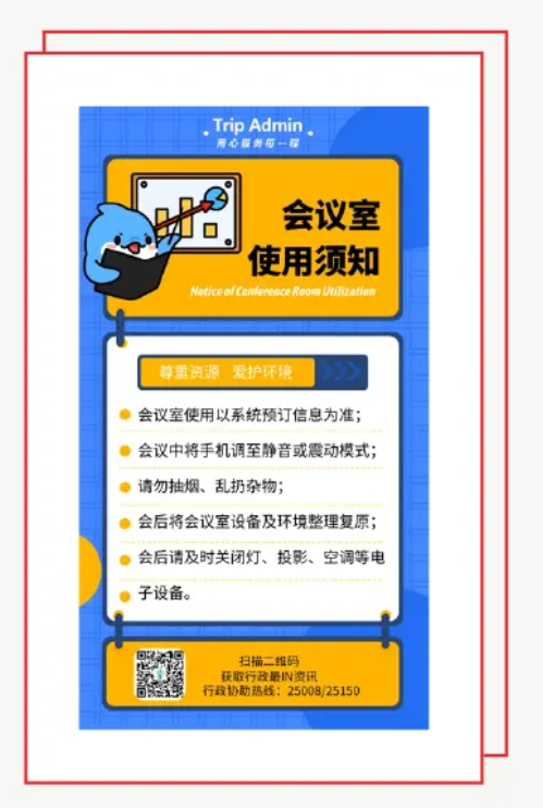 行政人在会议室通常也可以放置或者粘贴一些小提示,例如携程集团的会议室粘贴的”会后请将会议室设备及环境整理复原“、“请勿吸烟”、“爱护会议环境”这一类的维护会议室的提示语。