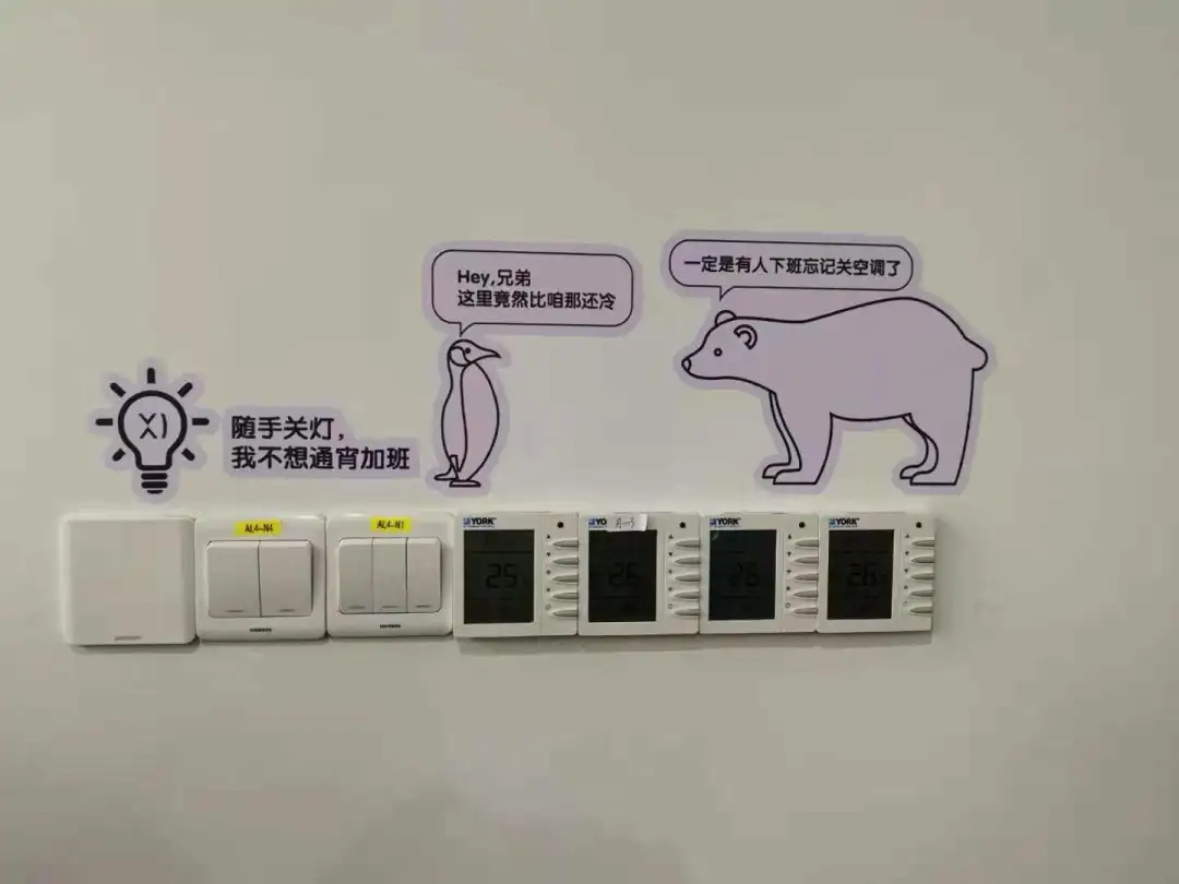 使用空调的时候,需要提示大家温度的调节方法和最低不能低于多少,而无需开空调时,则需要提醒大家及时断电等。