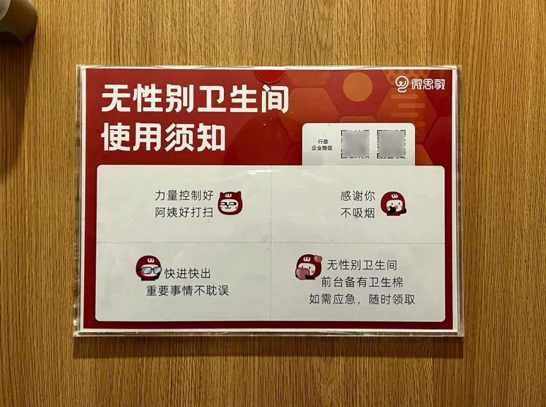 “无性别卫生间,前台备有卫生棉,如需应急,随时领取”