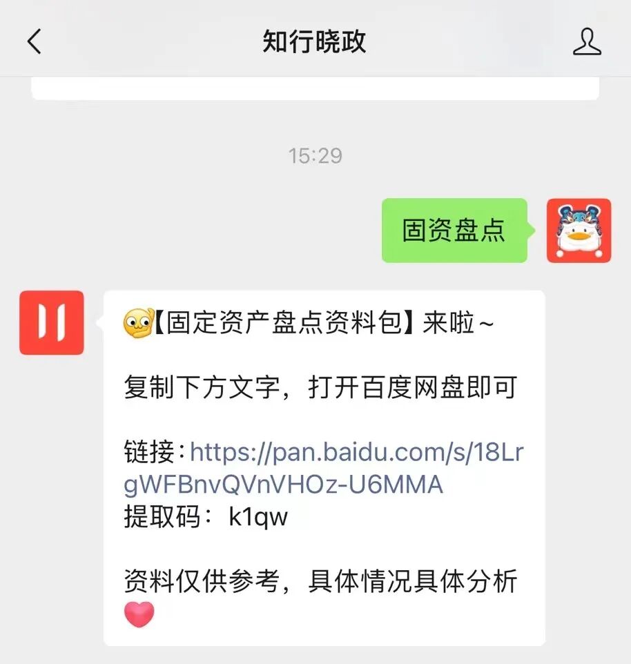 希望以上内容能帮到大家,在固资盘点工作中更加顺畅,小知准备了【固定资产盘点资料包】,需要的小伙伴可以给【知行晓政】公众号发送消息“固资盘点”获取~