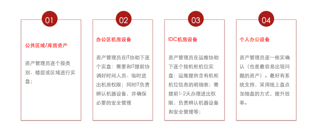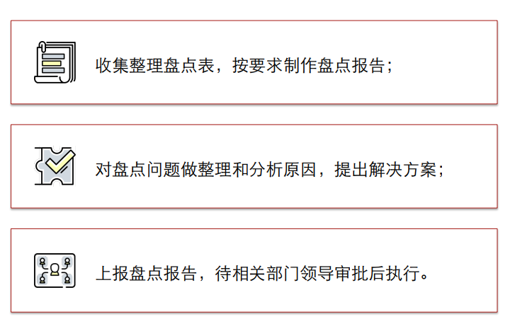 · 行政部或资产部:计划、推动并完成整个盘点,出具盘点报告、完成最后的资产处置