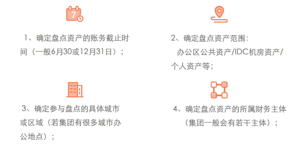 具体来说,需要明确固定资产盘点的账务截止时间、盘点的资产范围、参与盘点的办公区和财务主体。