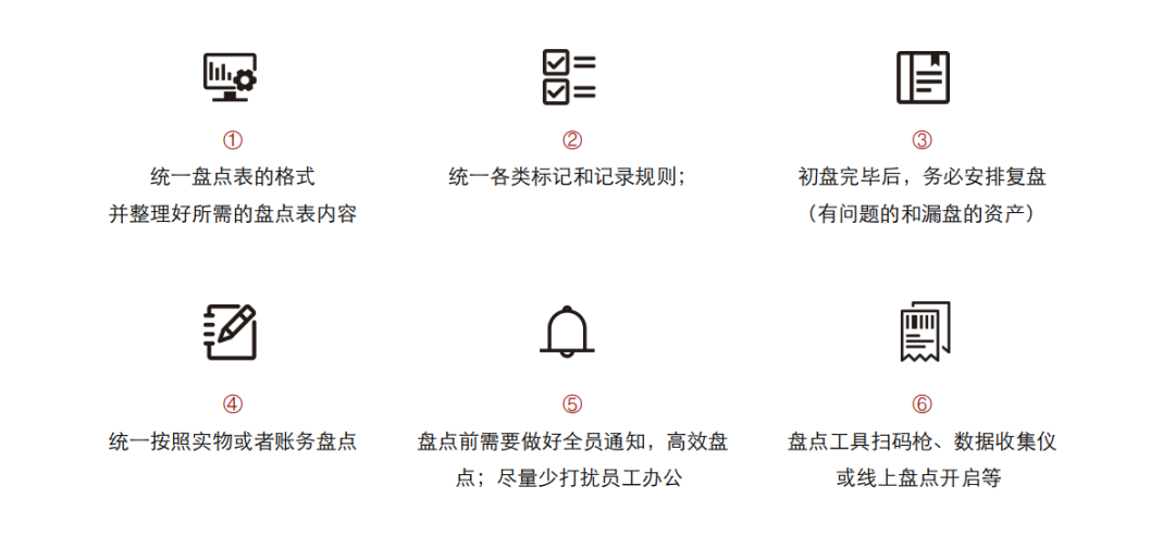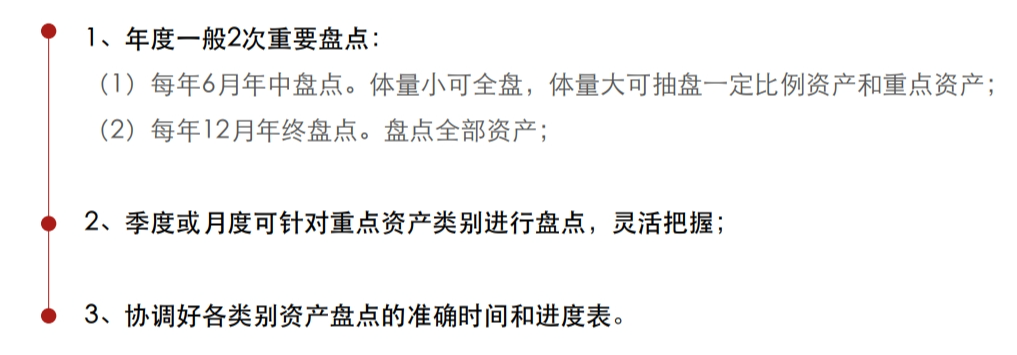 其中包括明确固定资产盘点的目的、确定固定资产盘点日期、分配固定资产盘点相关方的职责、制定及明确沟通机制、制作固定资产盘点清单,并根据己司情况,选择合适的盘点方法。