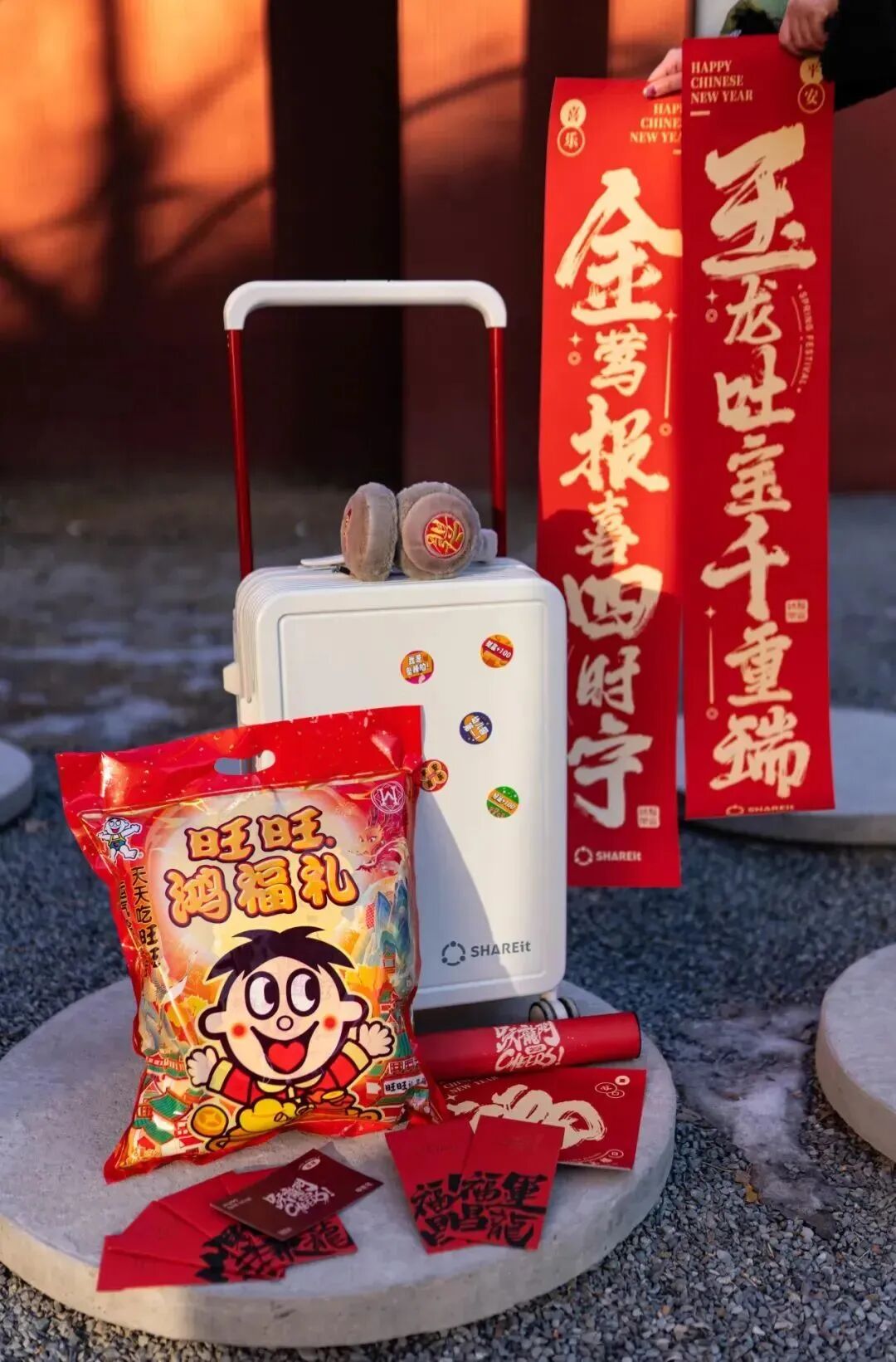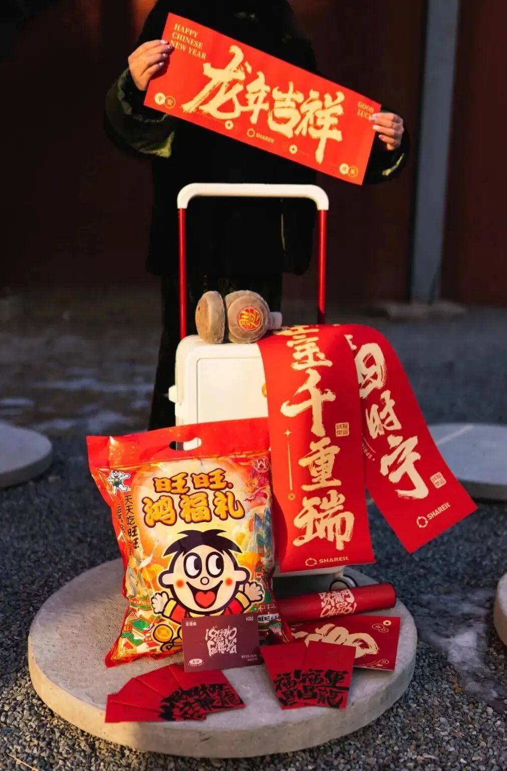 茄子科技2024新年礼盒的主题为“财旺兼龍”,内含行李箱、耳捂、旺旺大礼包、春联套装、红包。