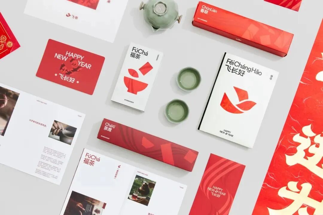 整体设计中更是以夔龙纹为灵感,以先进碰撞传统的形式,巧妙的融入了飞书独有的飘带符号,为礼盒注入一份了独特的灵魂。