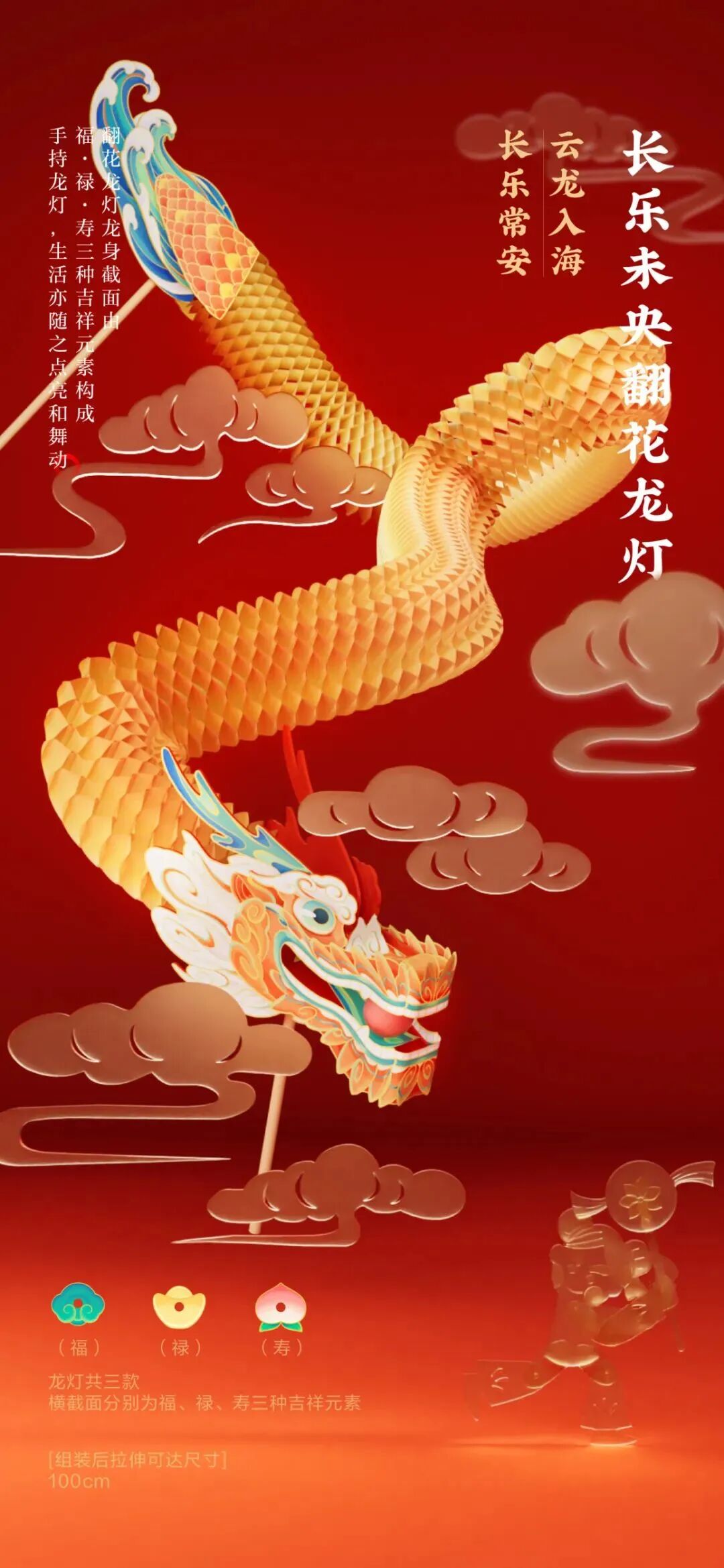 长乐未央翻花龙灯,龙身截面由福、禄、寿3种吉祥元素构成,手持龙灯,生活亦随之点亮和舞动。