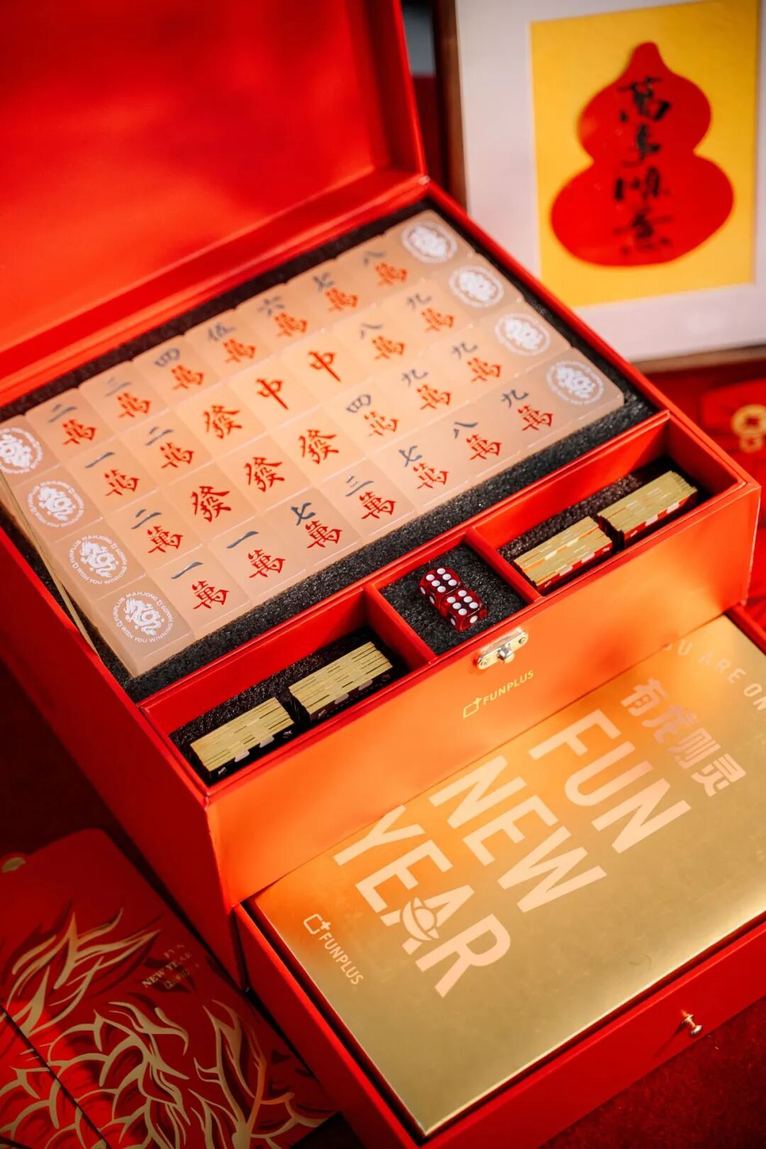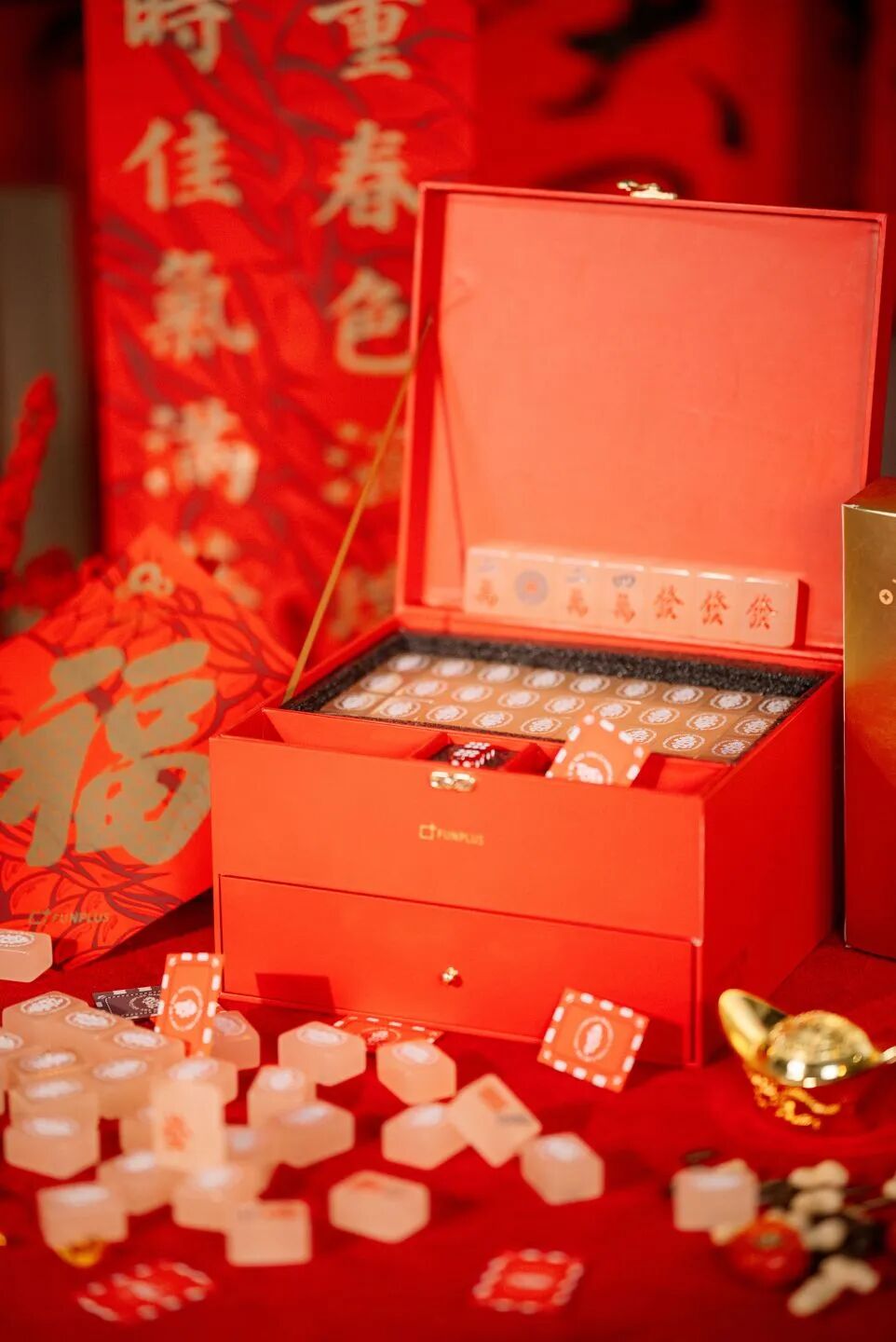 定制麻将套装:麻将背面、桌布、筛子、麻将盒子均选择了春节红,妥妥的喜气洋洋四件套。