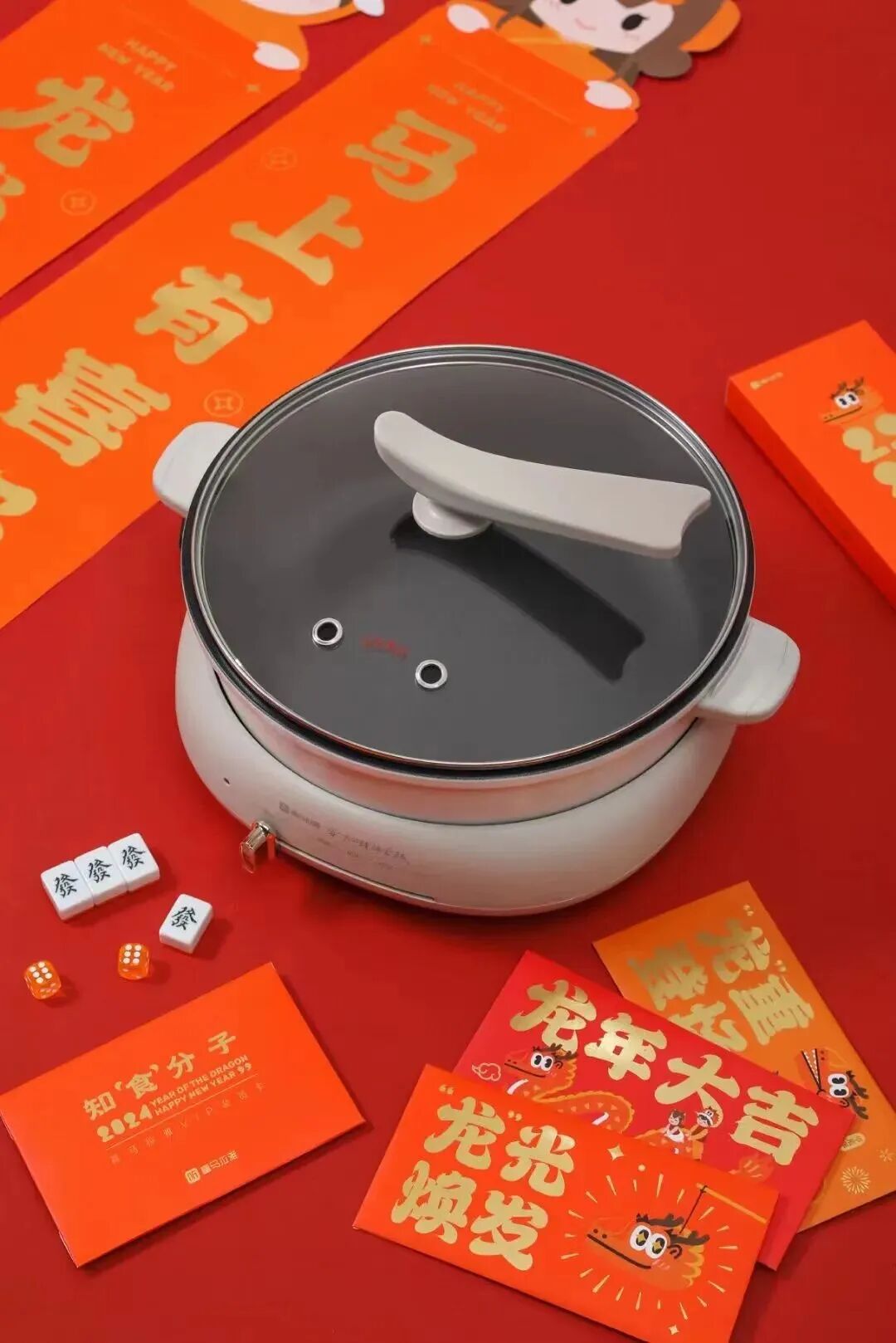 外包装为一个红色手提箱,礼盒内含电火锅、恺英定制麻将套装、食来运转零食大礼包、龙年限定龙跃虎头帽、还有春节必不可少的春联福字、新春窗花、新春红包。新的一年,与家人共享新年欢乐时光~