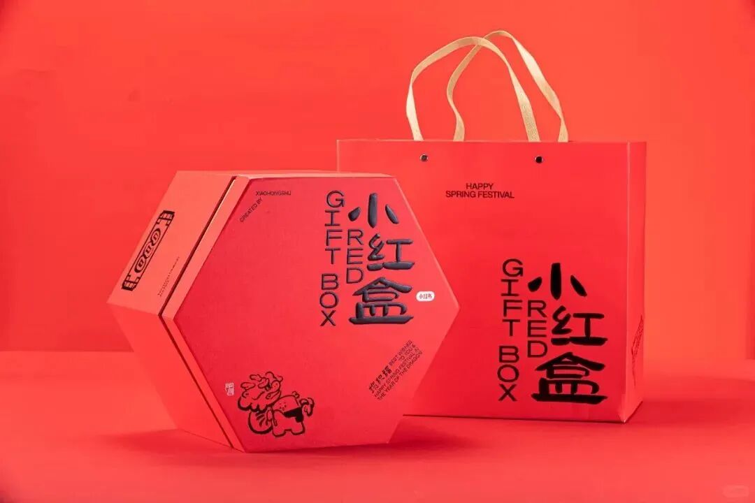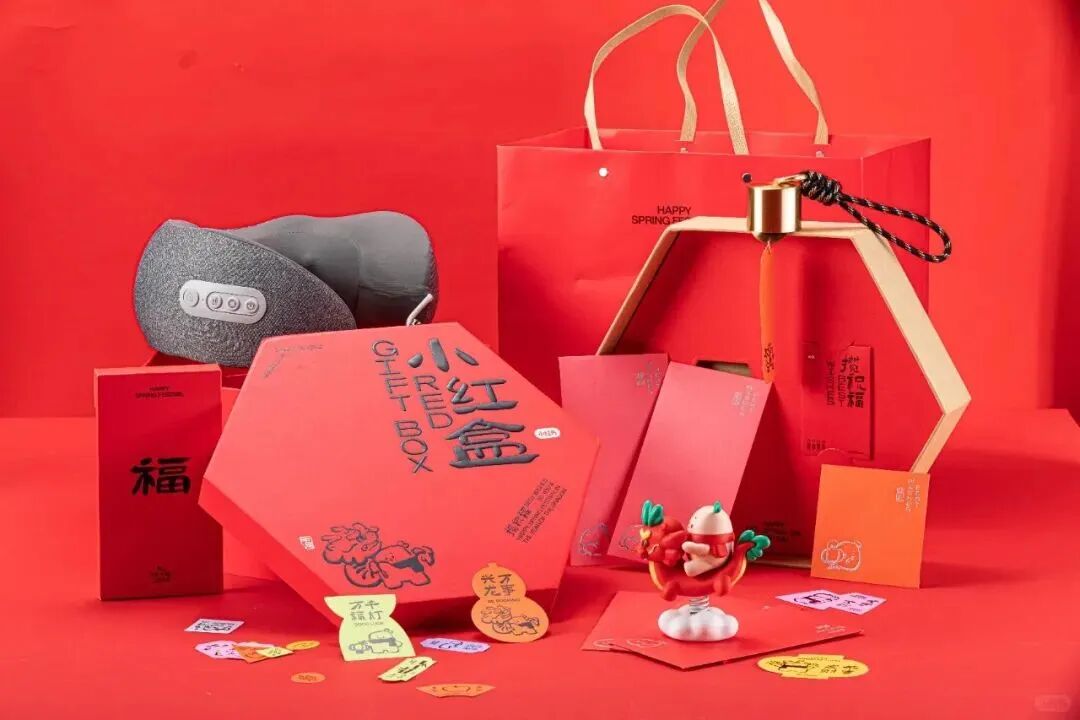 小红书龙年新春礼盒以传统全(攒)盒为灵感,以"阖阖美美"为主题打造了新年小红盒,盒盒美美,每一盒都攒多种美好祝福于一身。