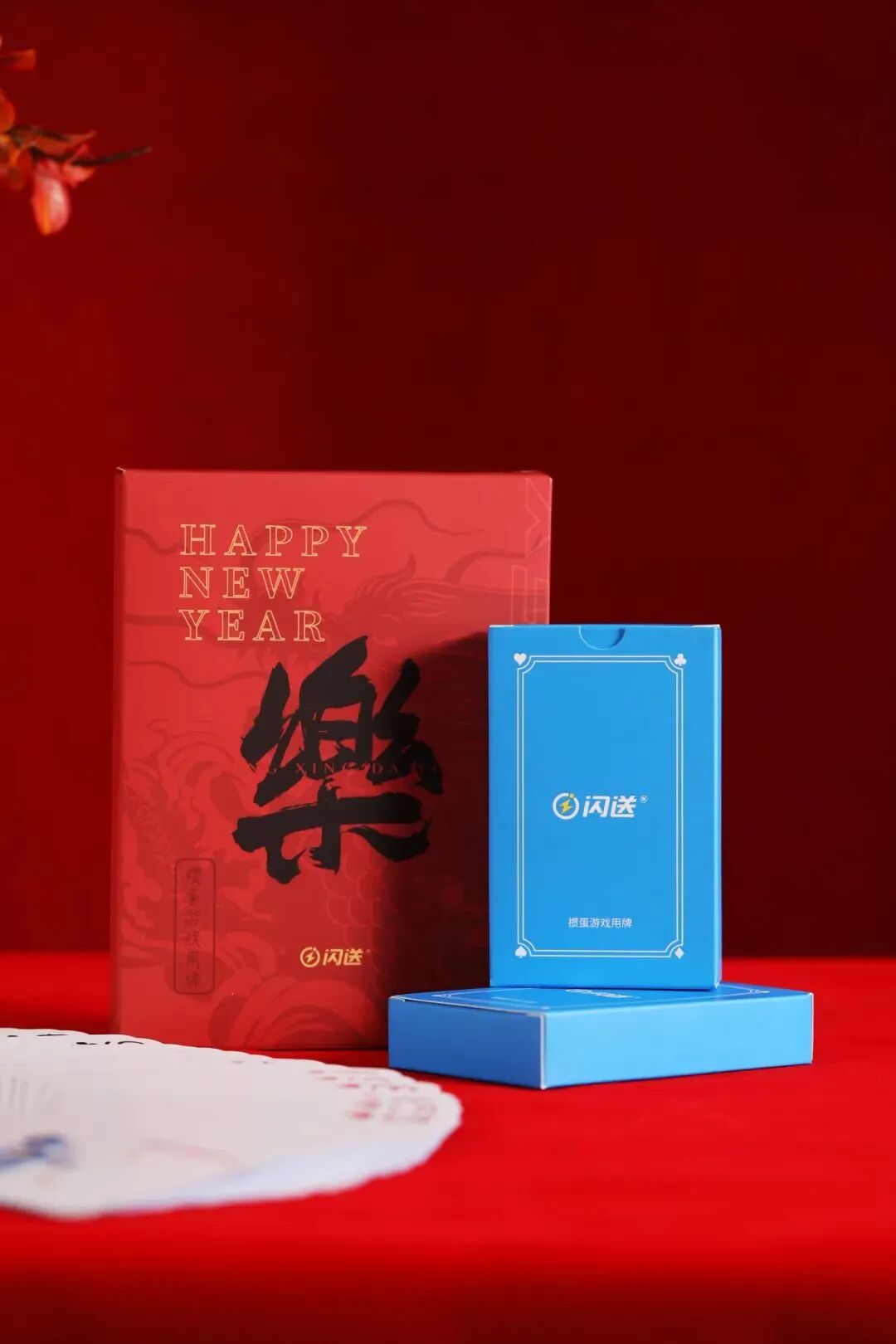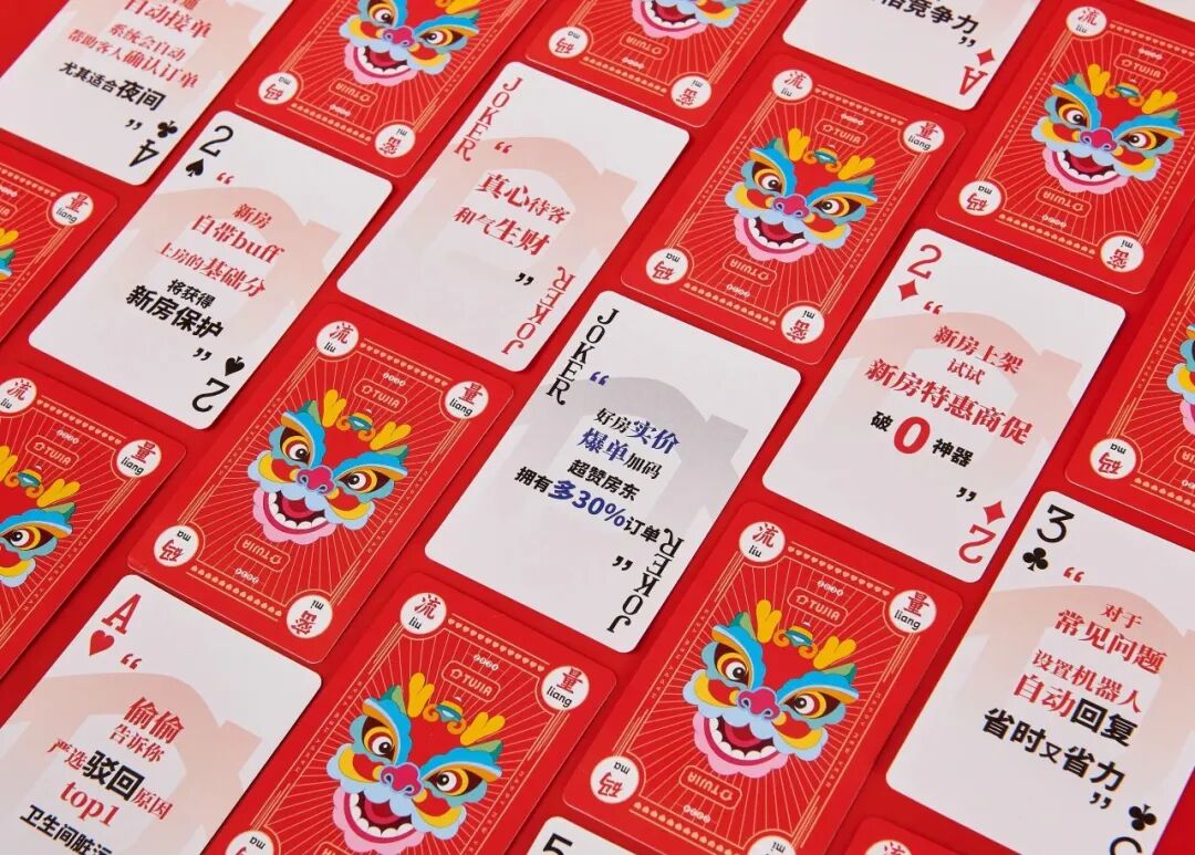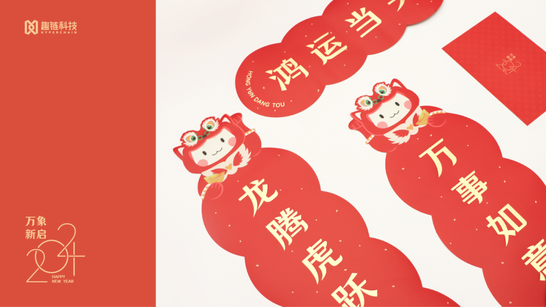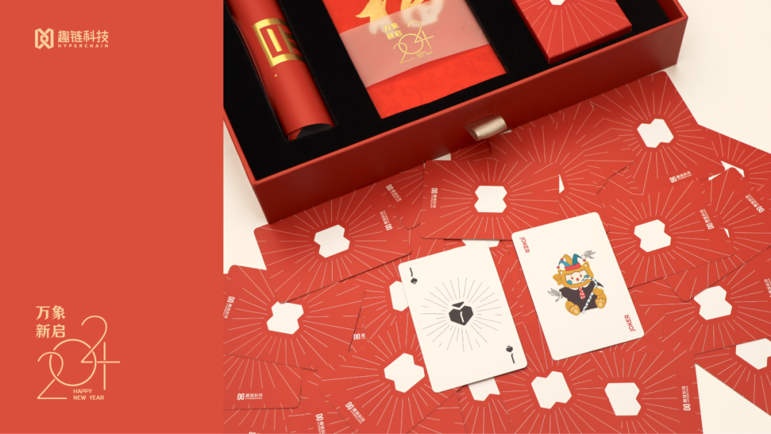 上层为春节必备的春联套装和红包,还有一副趣链定制扑克牌,新春佳节与家人好友围坐打牌,欢乐氛围拉满。