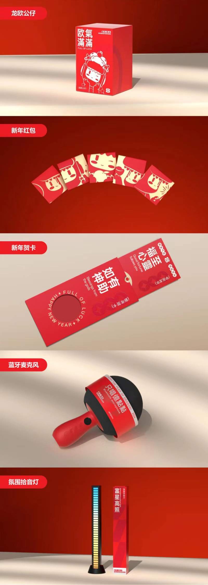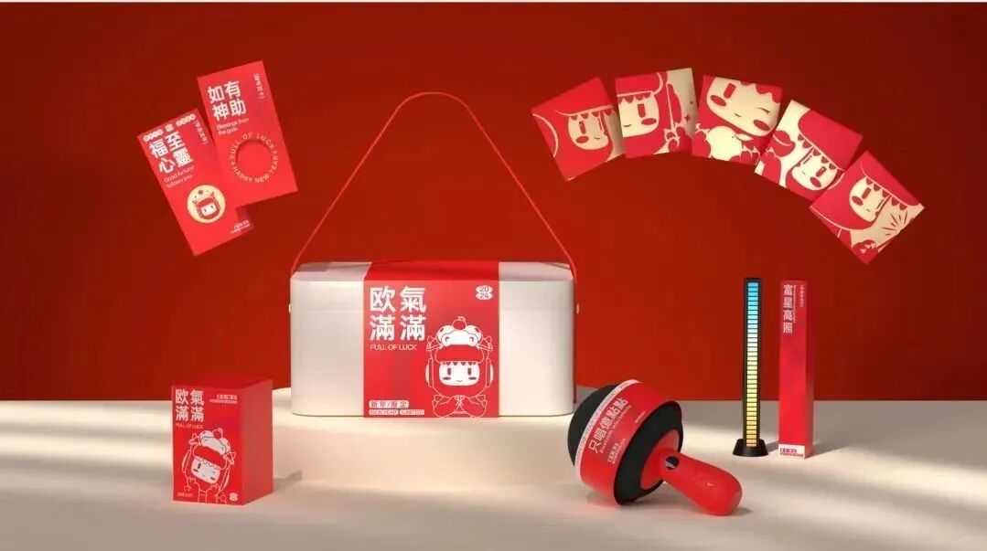 礼盒内含龙年限定龙欧公仔、新年红蓝牙麦克风、富星高照氛围拾音灯、小欧定制新年红包和新年贺卡,诚意满满。