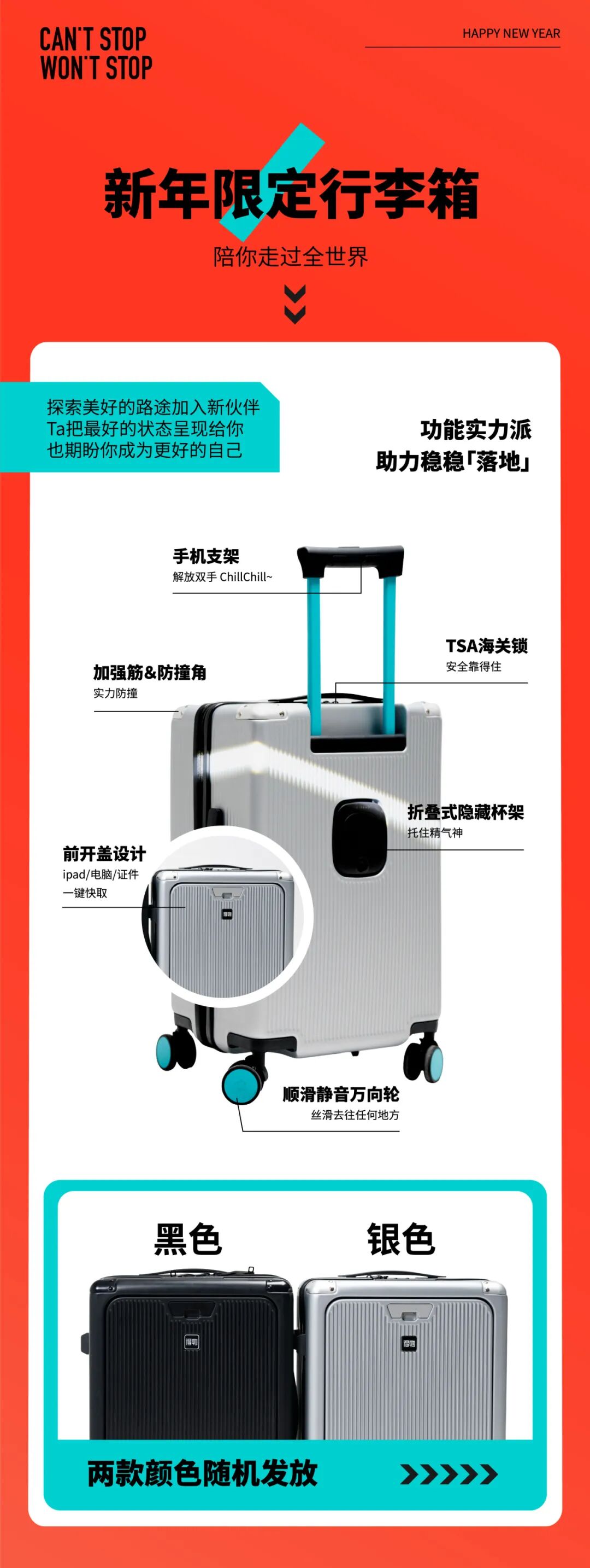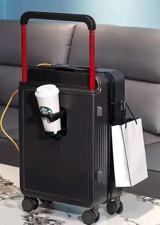 20寸可登机行李箱选用了经典黑白双色、红色拉杆的样式,贴合新年气氛又不失时尚感。箱身处处暗藏小玄机,背面设有可折叠杯架,侧面设有挂钩、外接USB充电口。简约设计更显质感。