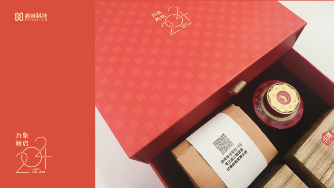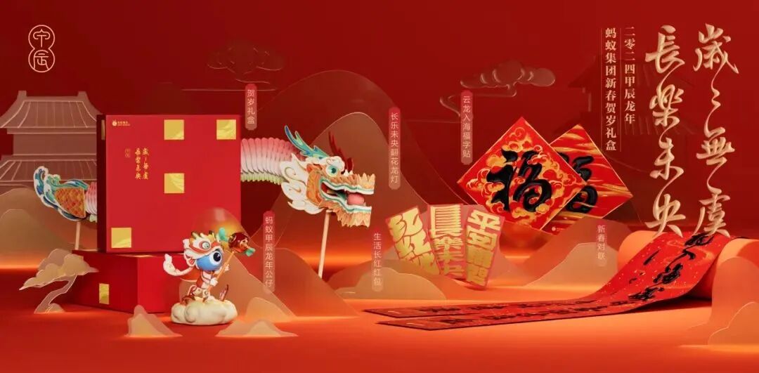 蚂蚁集团2024新年礼盒主题为“岁岁无虞,长乐未央”,礼盒包装选用烫金龙身翻腾起伏,穿越隔窗若隐若现,取“穿过万家灯火,福气绵延长久”之意。