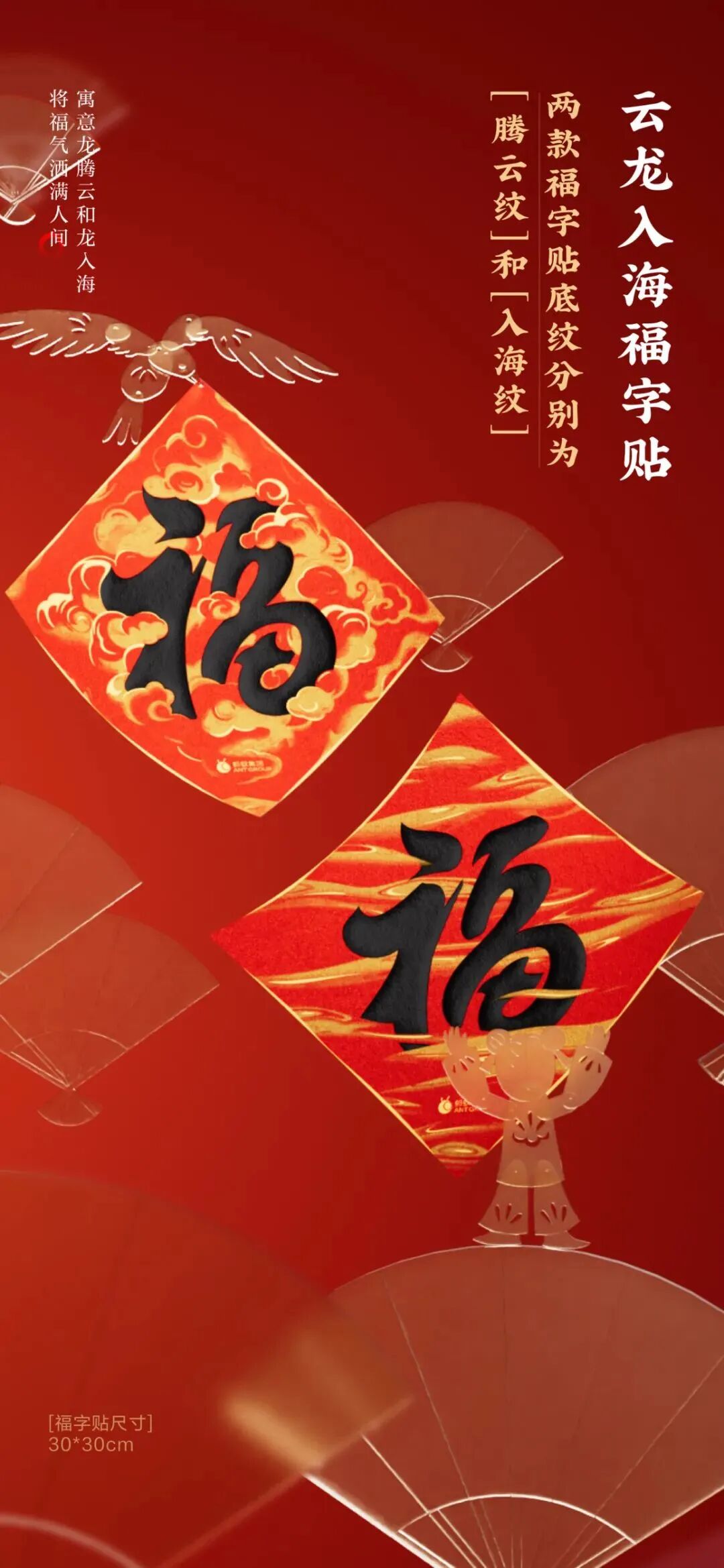 新春行书对联,首尾相接一笔落成,有世间美好事物长长久久不停歇之意;两款福字贴纹底分别为“腾云纹”和“入海纹”,寓意龙腾云和龙入海,将福气洒满人间;三对生活长红红包,最愿生活长红。