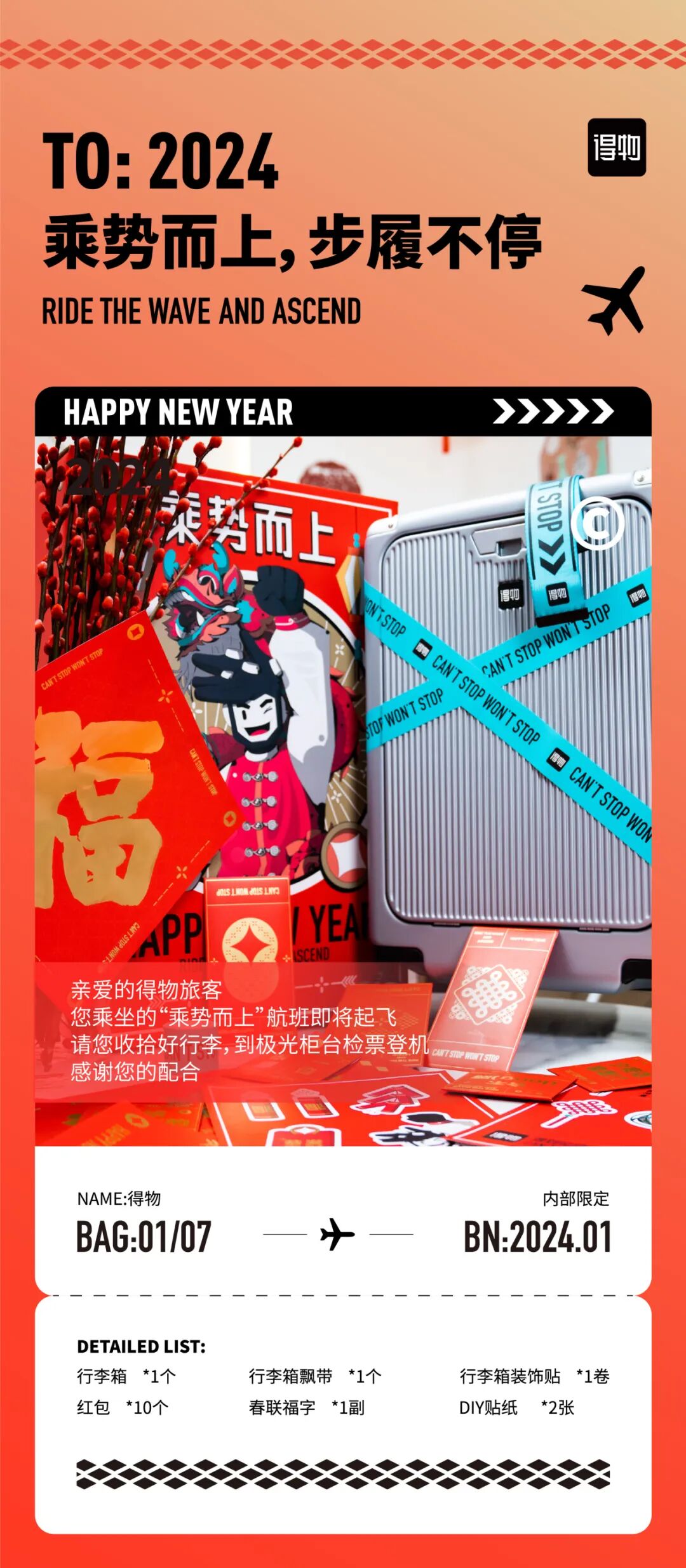 【乘势而上】2024龙年新年伊始,万象更新,势头升腾,充满了机遇与希望。这个春节得物以“行李箱”为主产品,呼应礼盒主题。寓意着得物er与得物共成长。