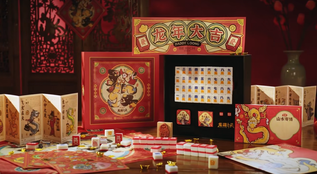 礼盒内的麻将三件套:mini麻将+定制麻将布+骰子,每一个单品都与小龙巧妙的结合在一起,将龙年的氛围感拉满。