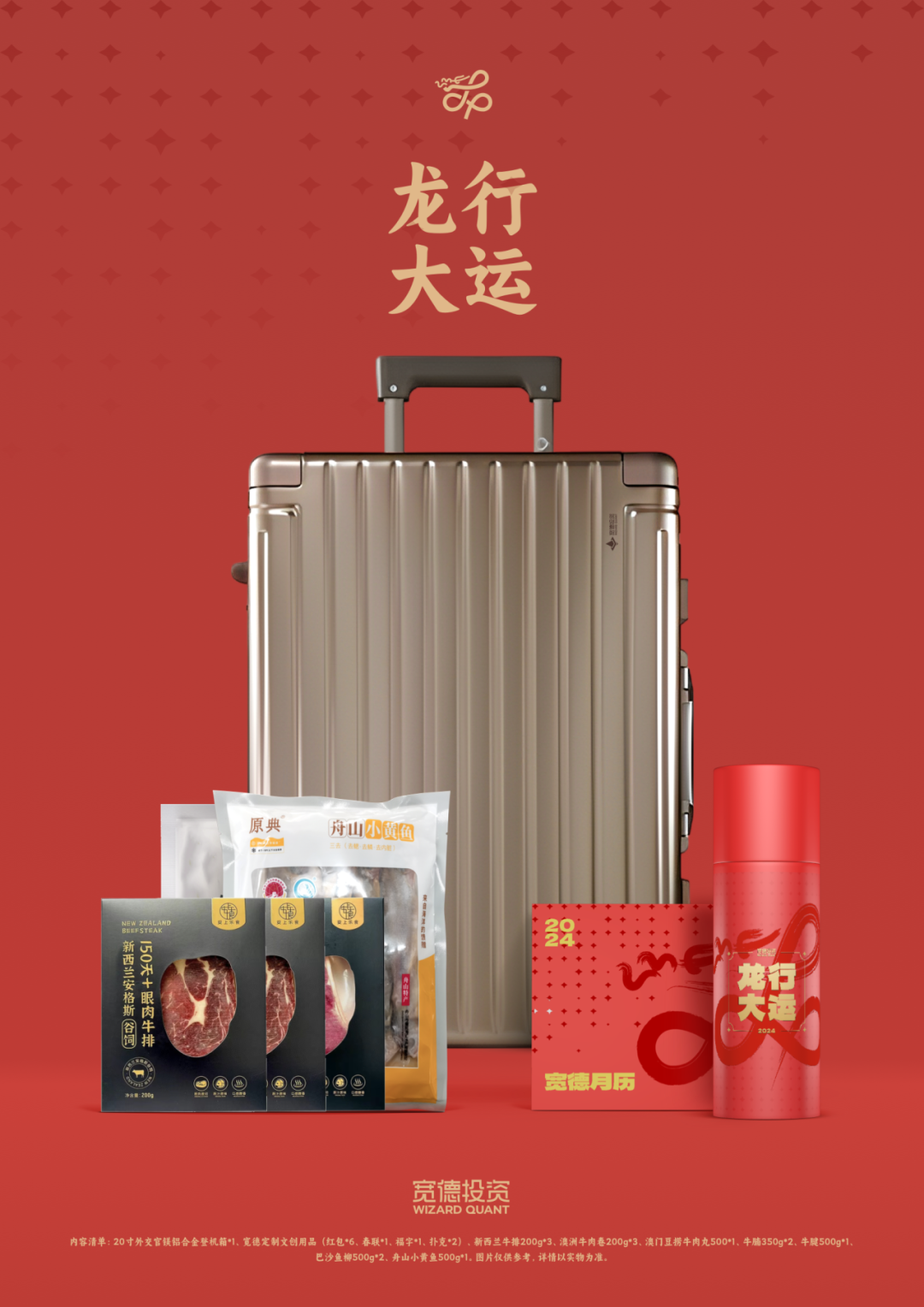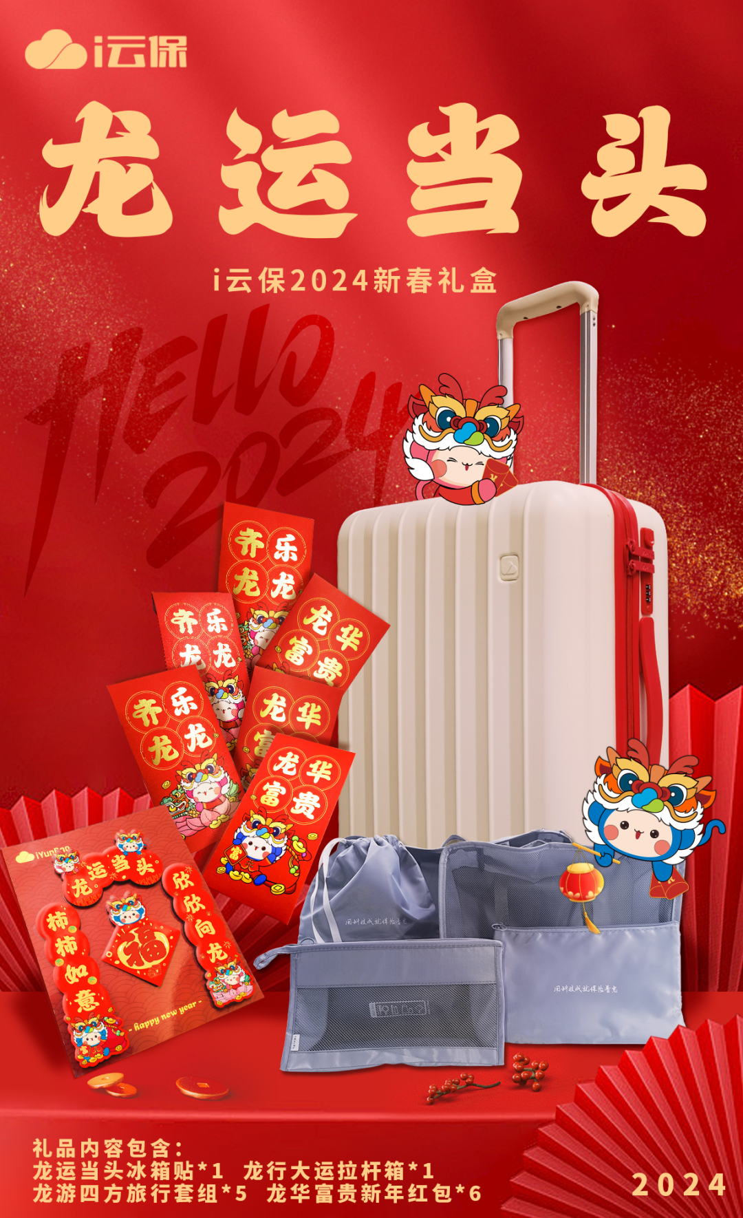 i云保2024新春礼盒主题为“龙运当头”,内含定制拉杆箱、旅行袋套组、定制冰箱贴、定制新年红包。