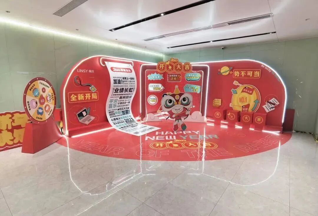 为了贴合新年喜气洋洋的气氛,可以用一些装饰物来装点职场,如门贴、挂件、KT板等。