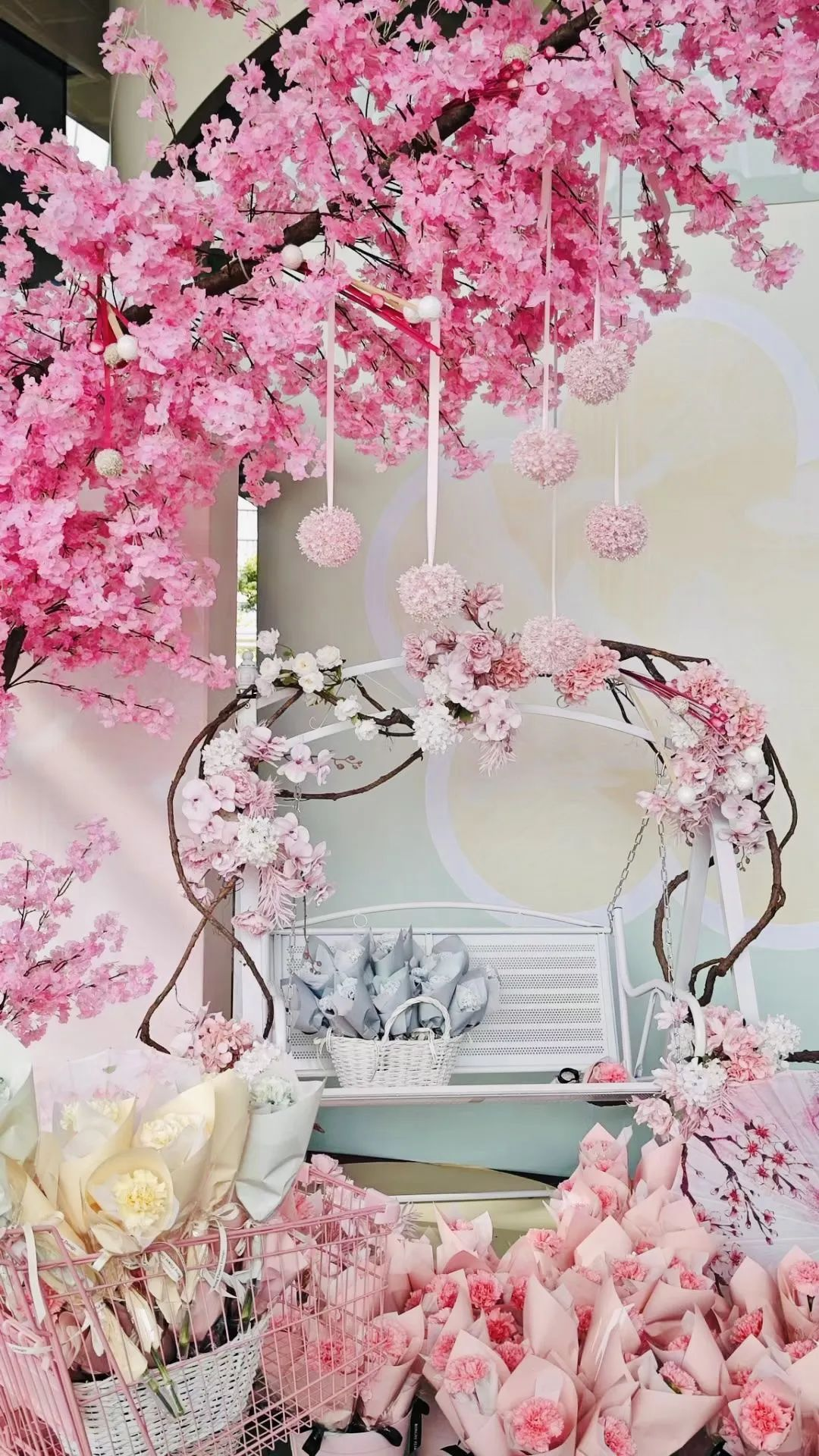 当然,一束花的仪式感也要安排上,可以在签到处设置一面鲜花签到墙,现场拍照打卡、签名、拿走花束,将仪式感拉满。