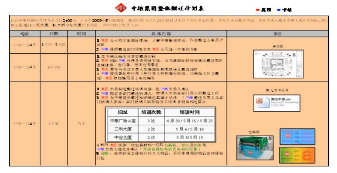 绝大多数的企业行政在搬家时都会做一份搬迁计划表,但这个计划表一般不会与企业搬迁供应商进行沟通与讨论,而是只告知供应商来拉货的时间点与现场指挥就开启了企业搬迁之路。