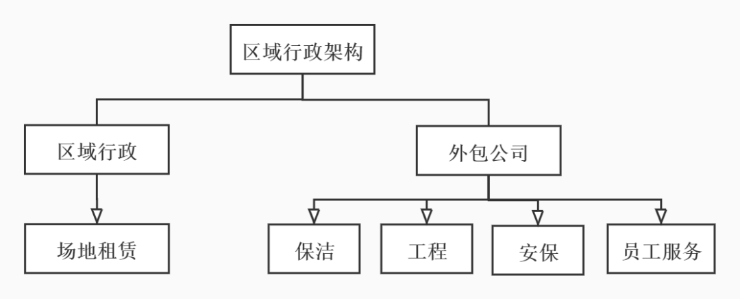 此架构适用于涉及海外市场的跨国企业集团。在对当地情况缺乏认知的情况下,建立业务外包型的组织架构是一种省时省力的方法。一般来说,可以由跨国区域行政负责办公场地的租赁,将职场场地运维全面外包,例如:工程、安保、保洁、员工服务等。